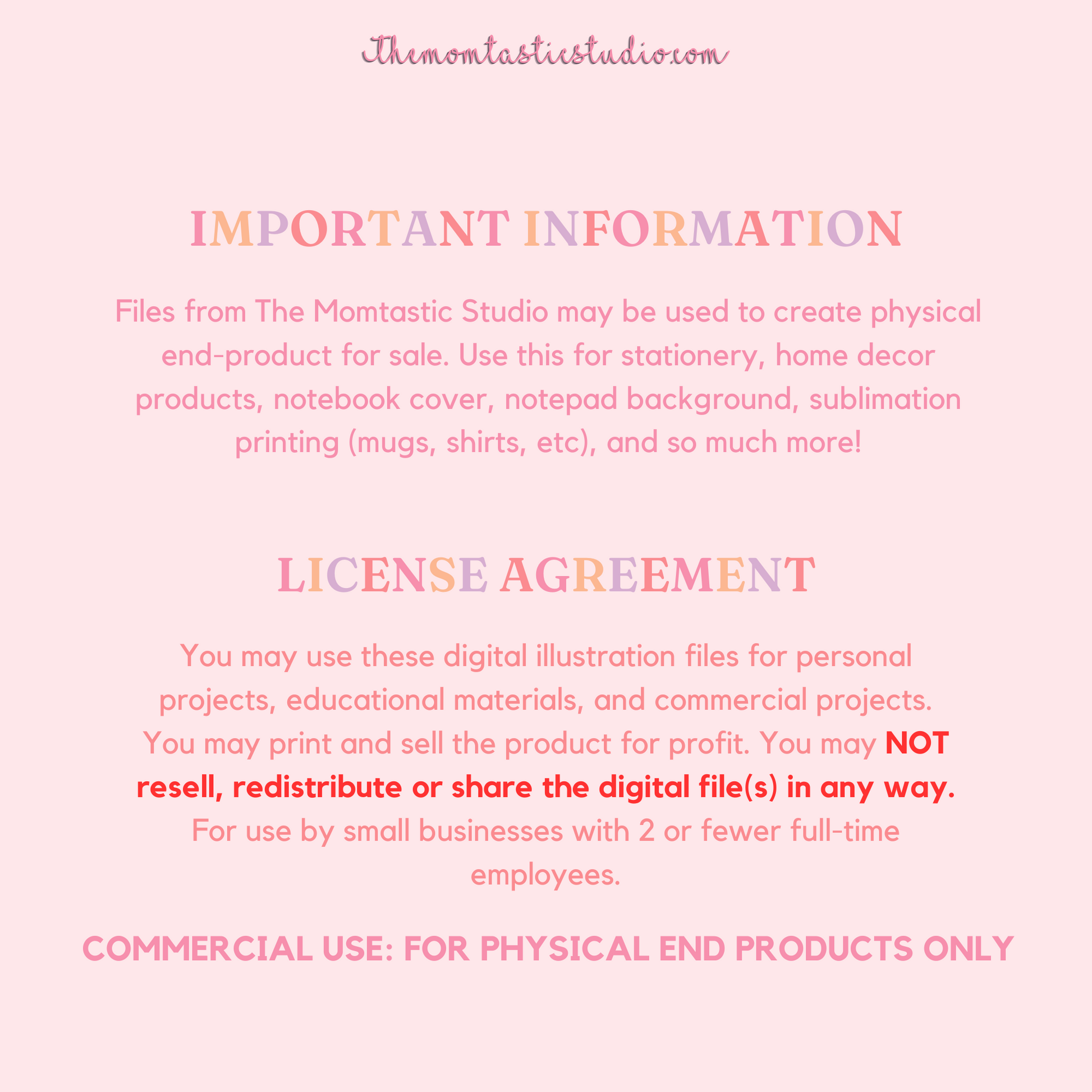 This file may be used to create physical end-product for sale. Use this for stationery, home decor products, notebook cover, notepad background, sublimation printing (mugs, shirts, etc), and so much more! Art must not be claimed as own or the digital file be shared, resold, or altered in any way.