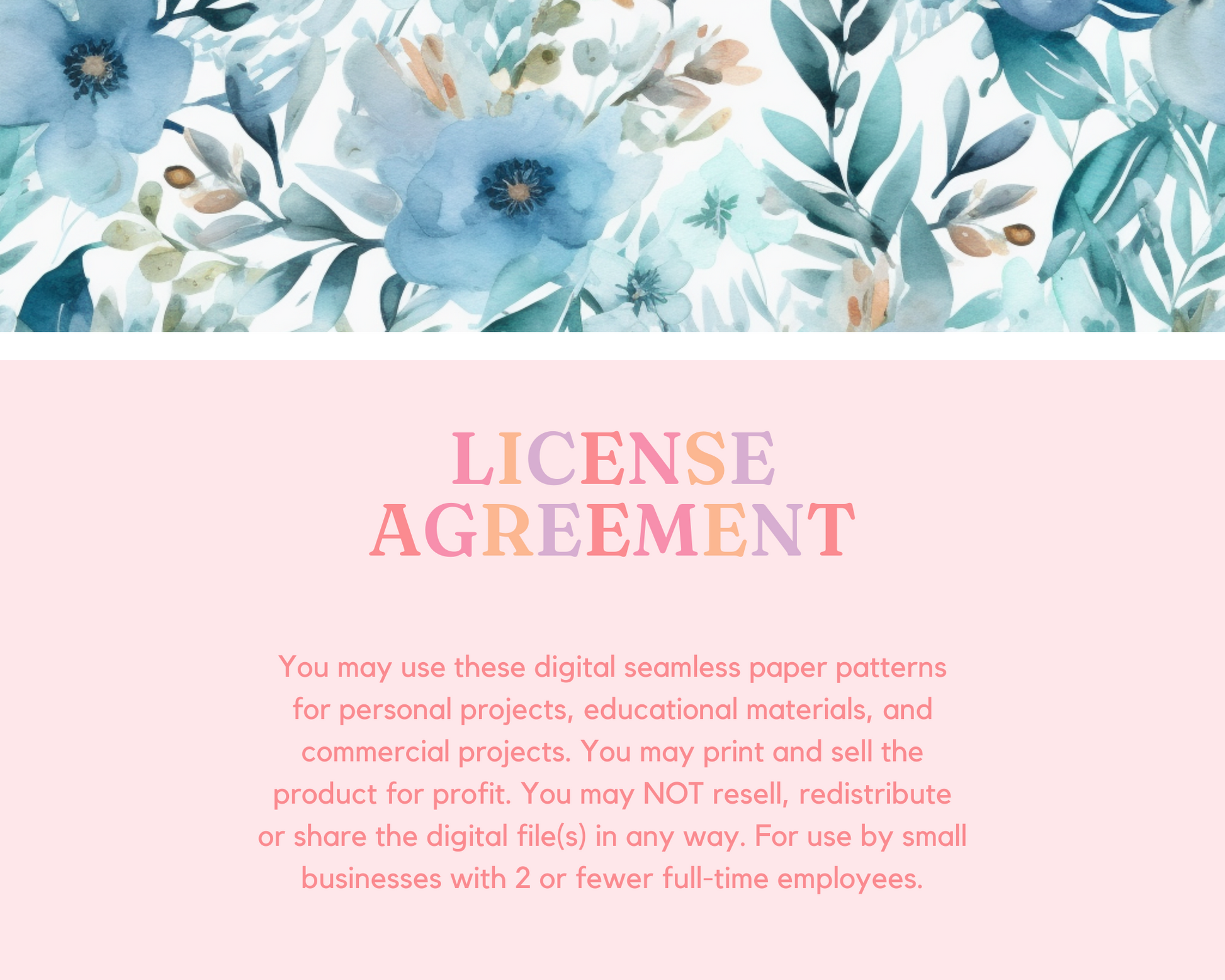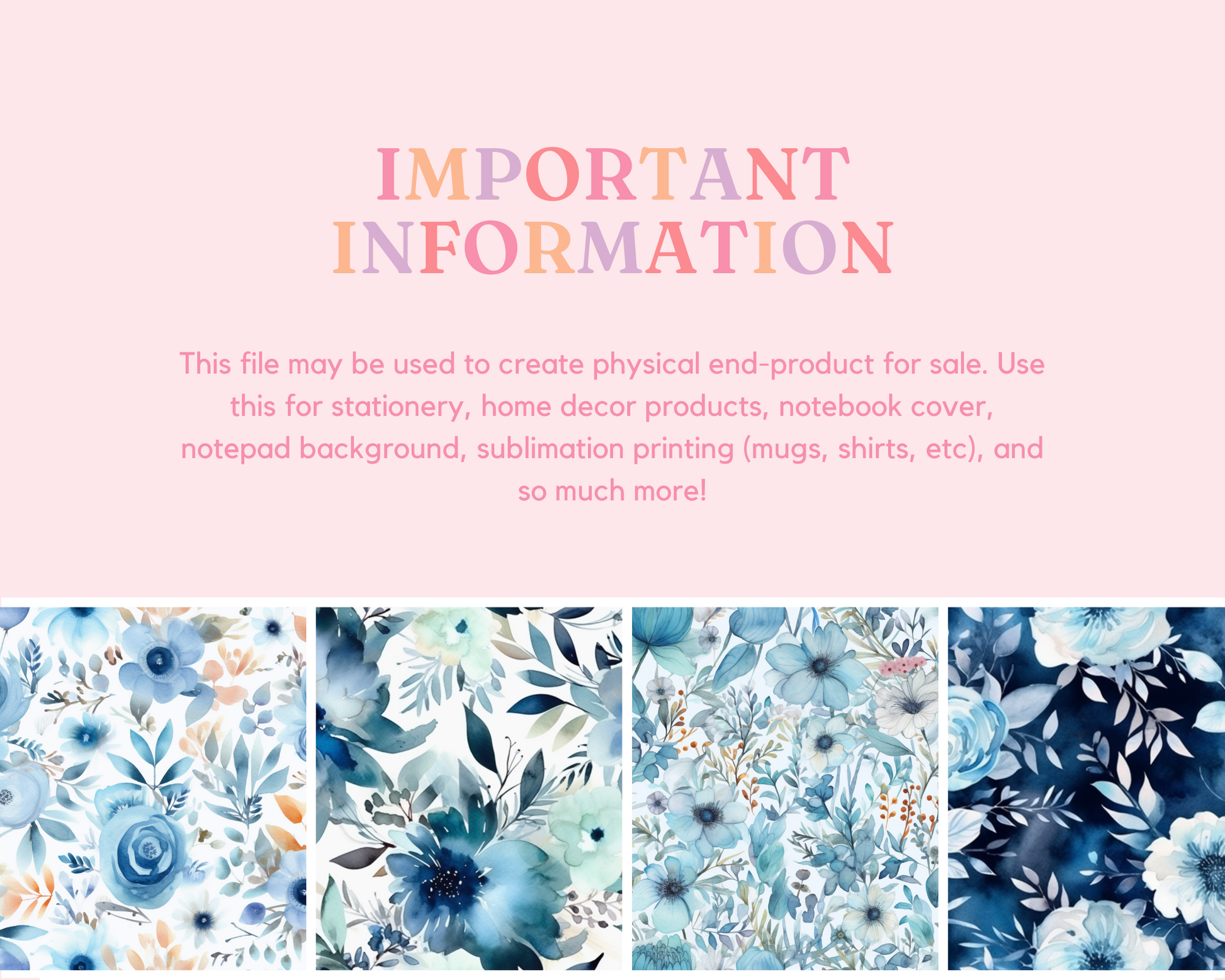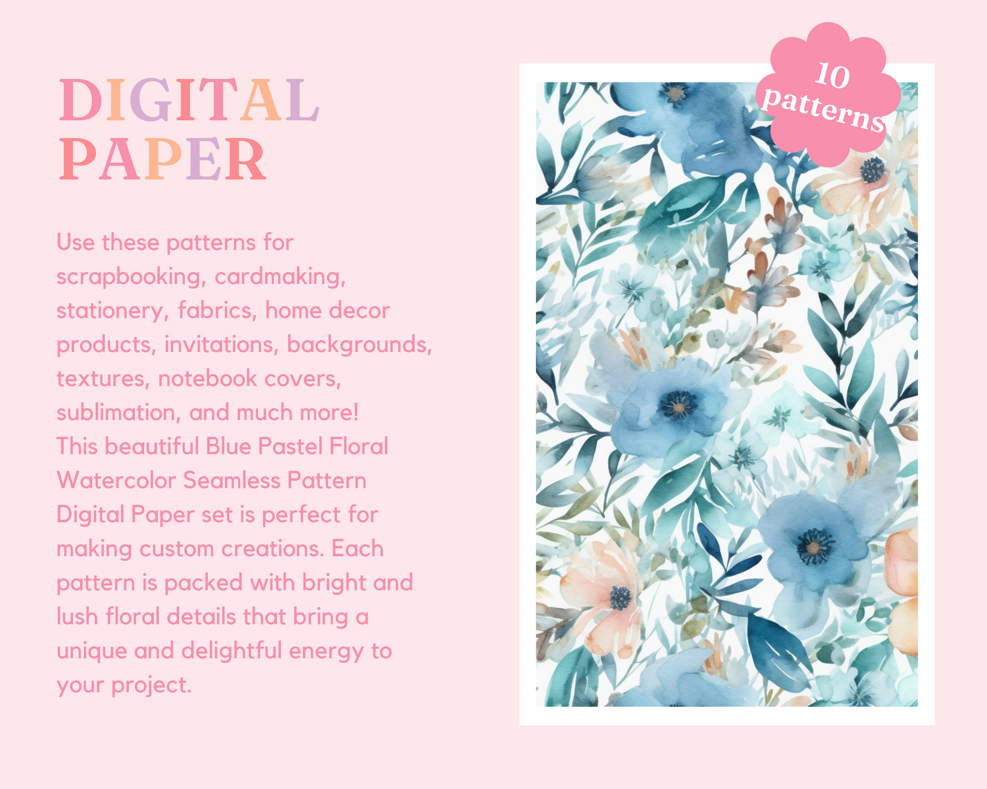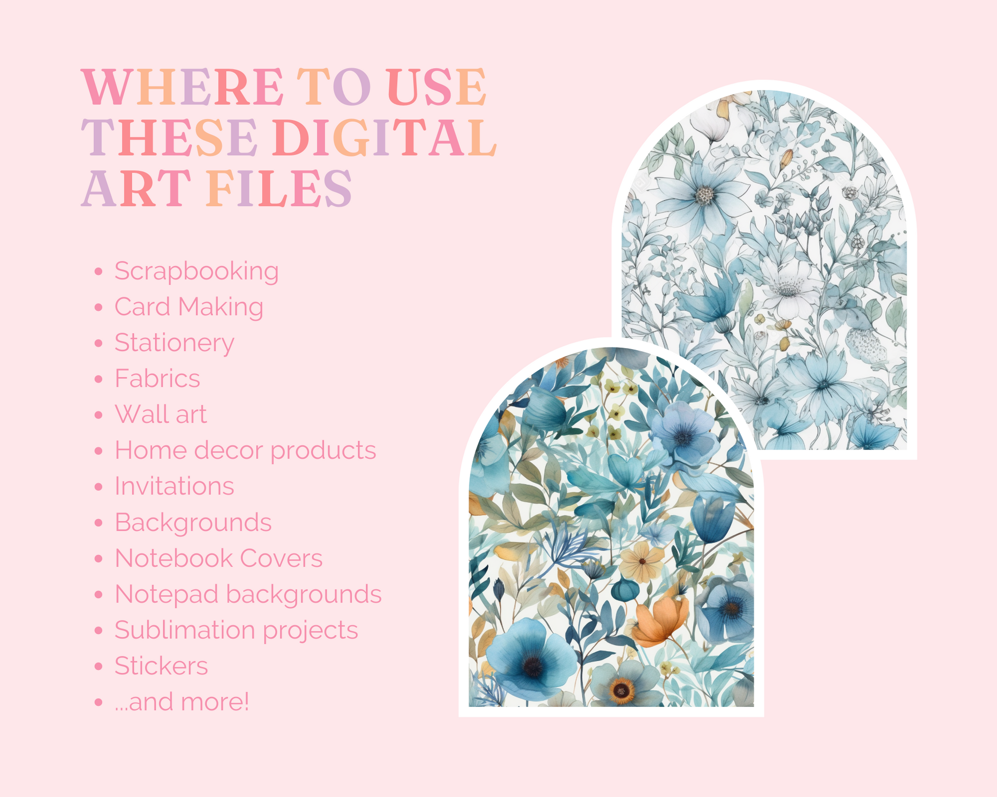 This beautiful Blue Pastel Floral Watercolor Seamless Pattern Digital Paper set is perfect for making custom creations. Each pattern is packed with bright and lush floral details that bring a unique and delightful energy to your project.
