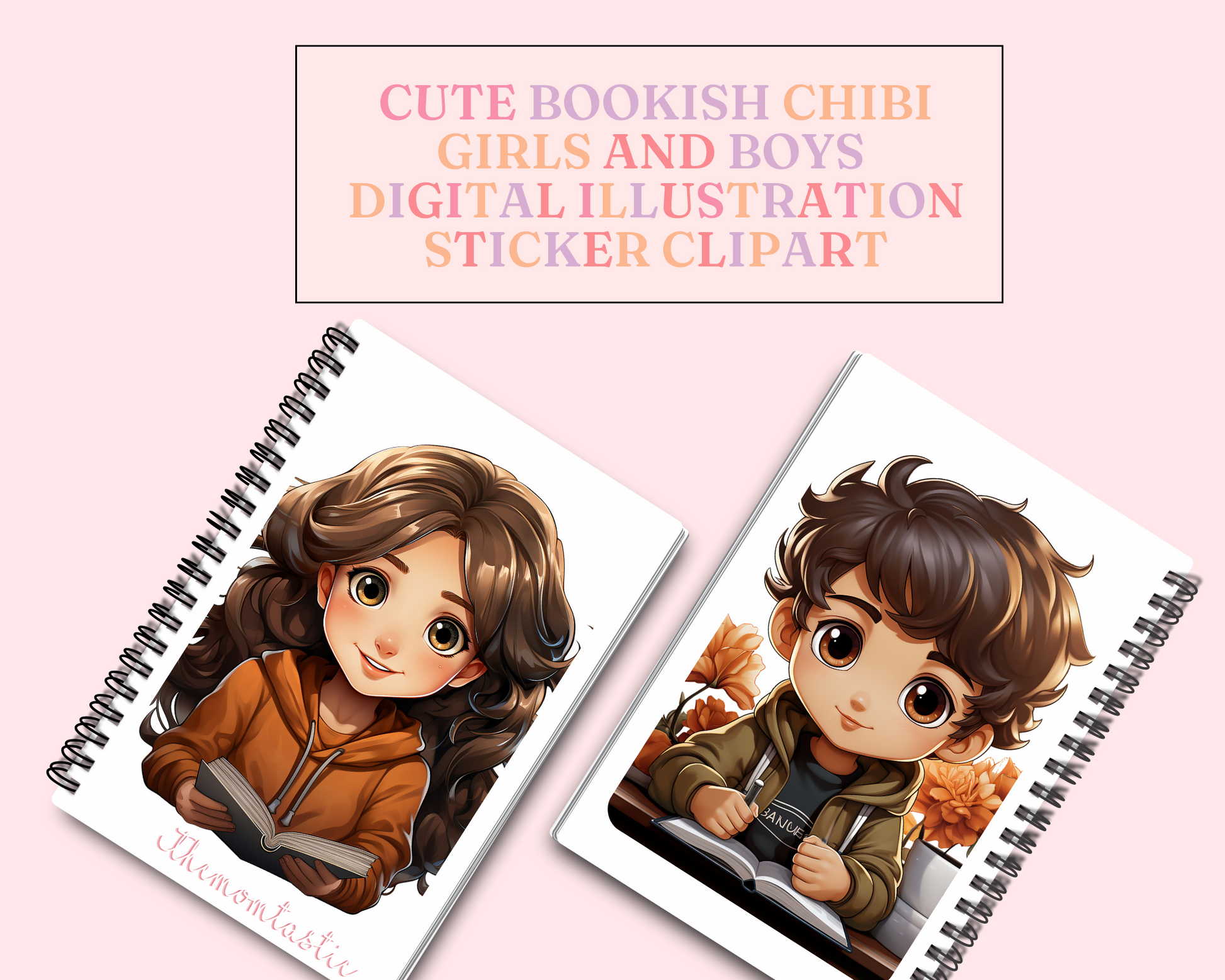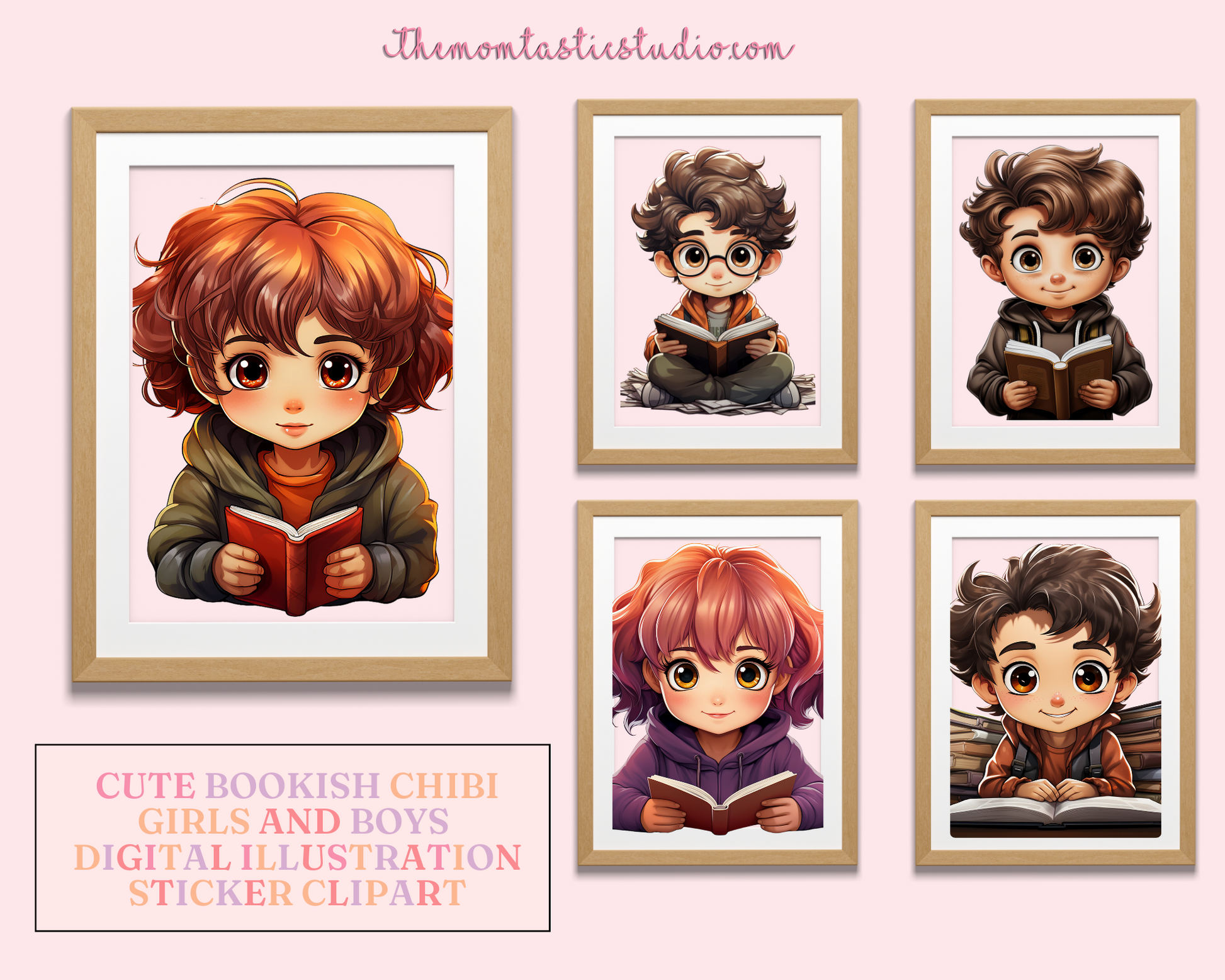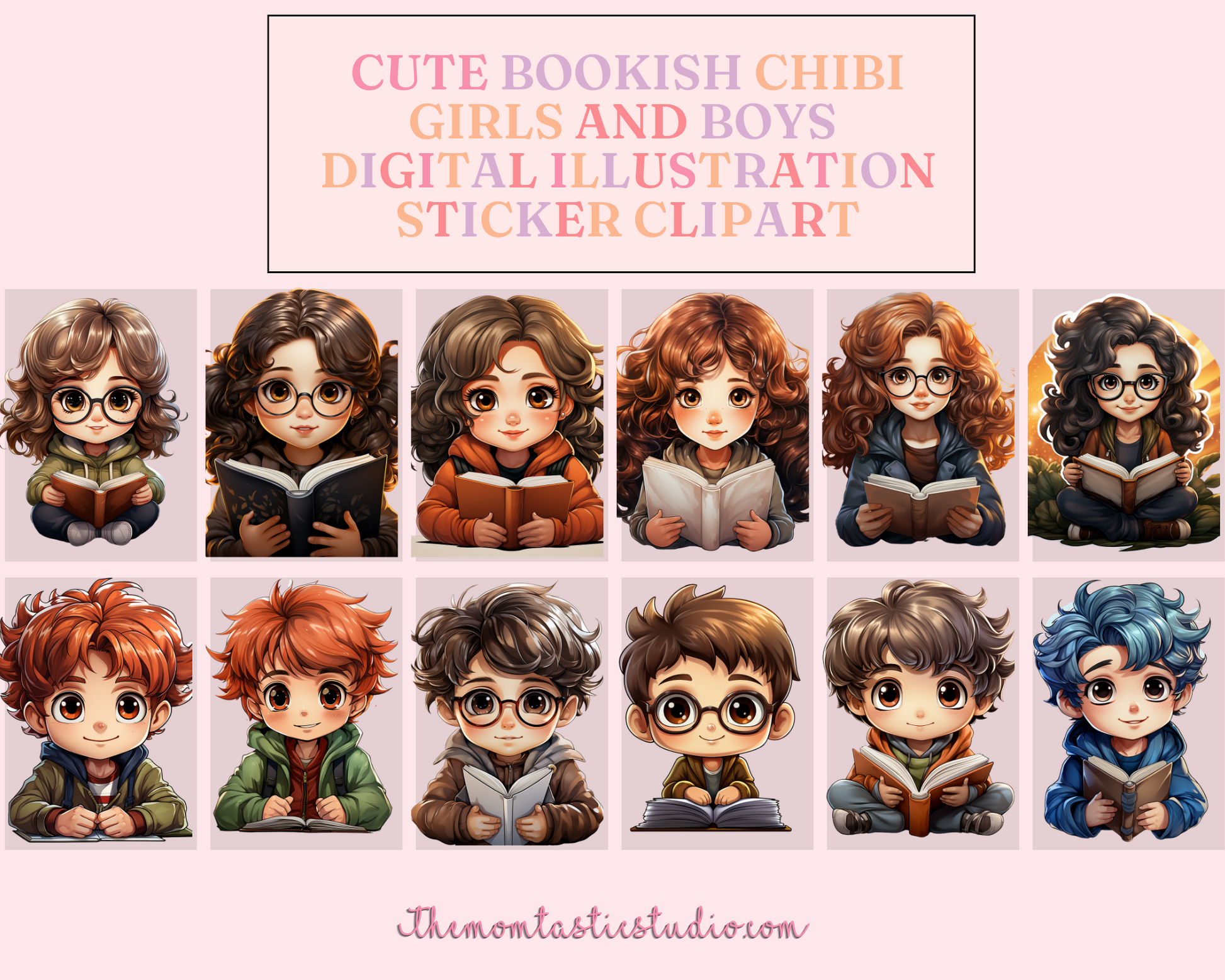 Cute Bookish Chibi Girls and Boys Sticker Clipart – Instant Download – High-Quality PNG - Transparent Background - Commercial Use