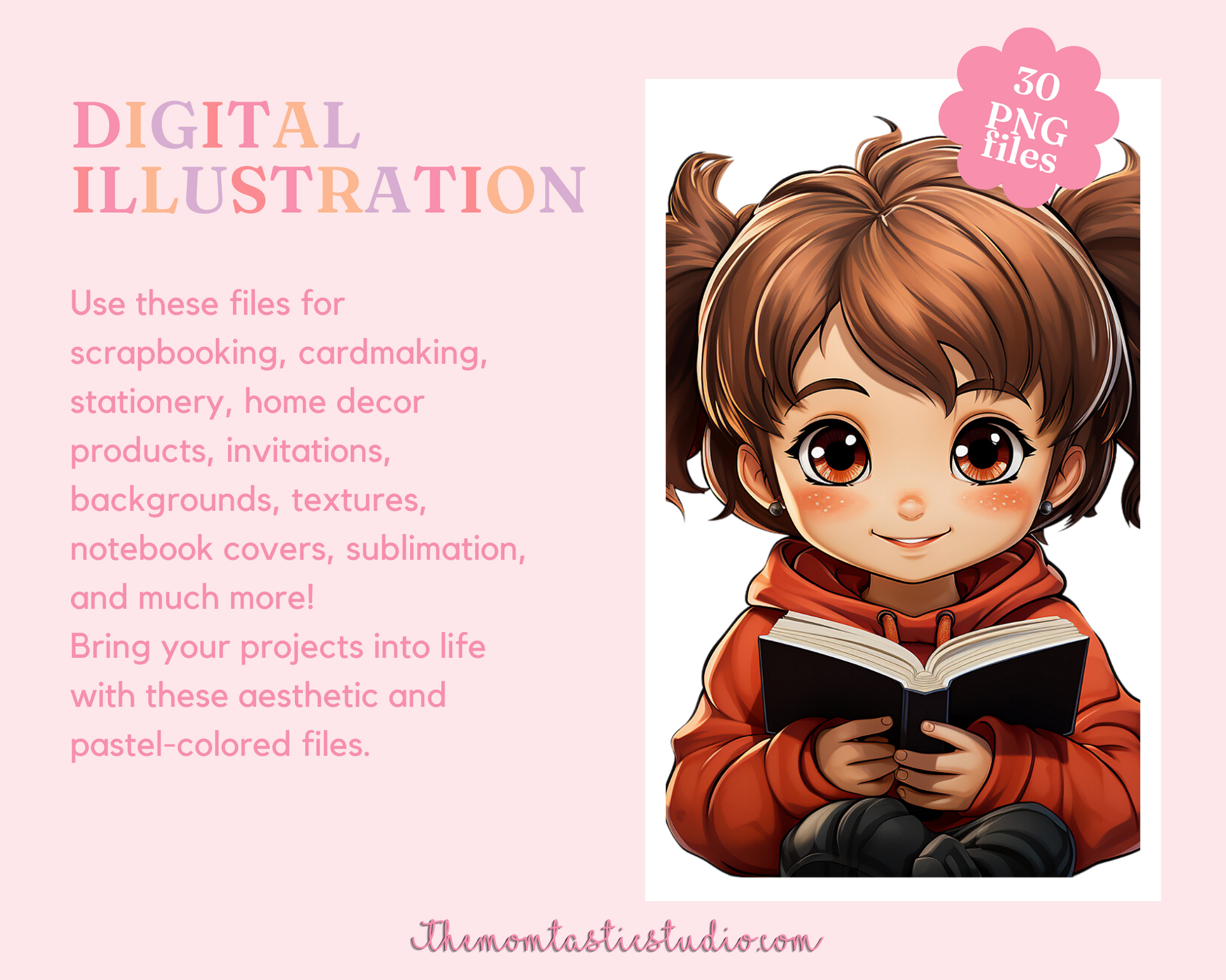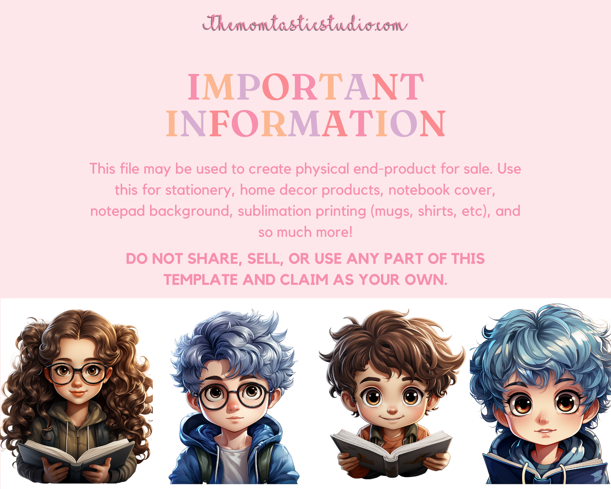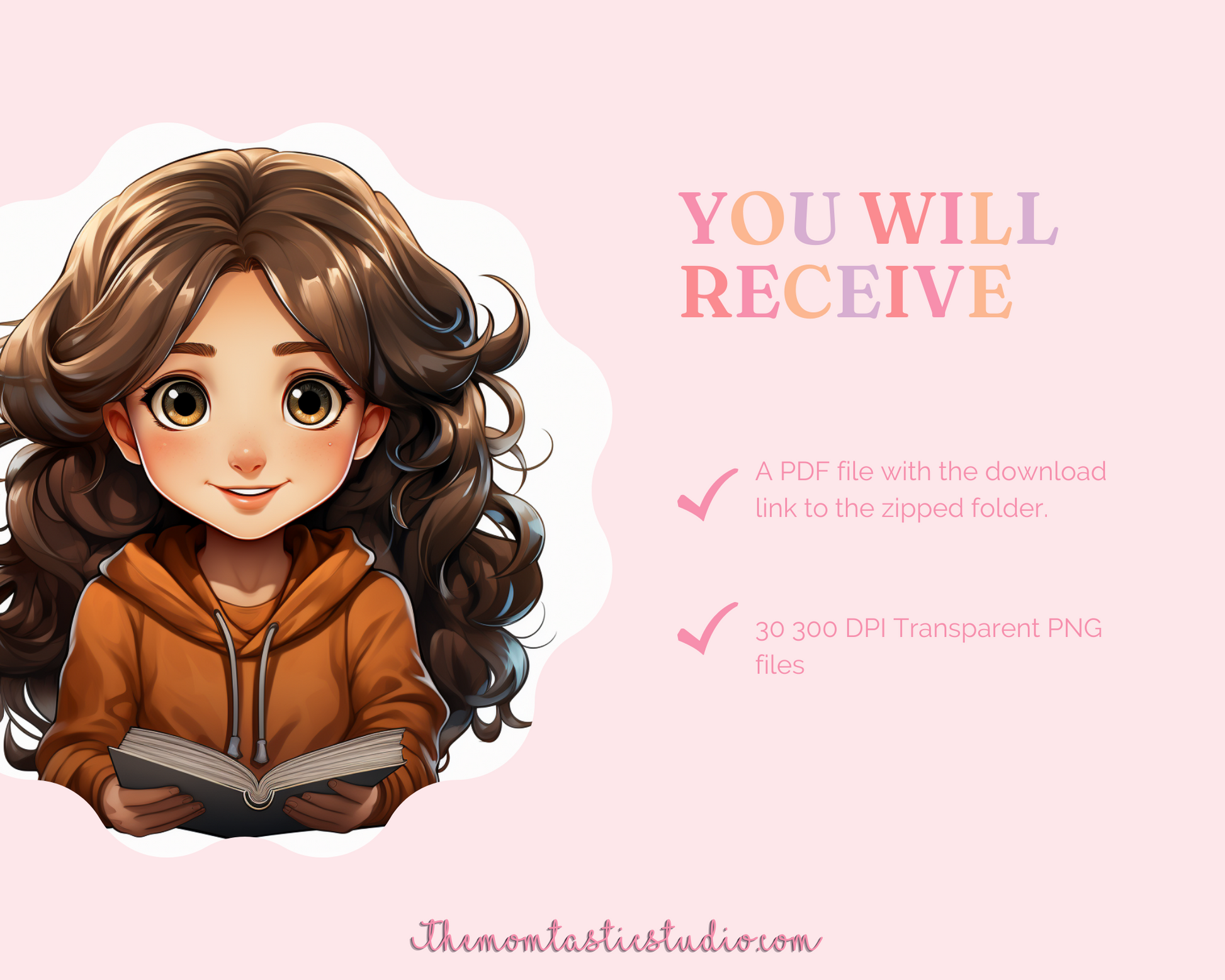 Cute Bookish Chibi Girls and Boys Sticker Clipart – Instant Download – High-Quality PNG - Transparent Background - Commercial Use