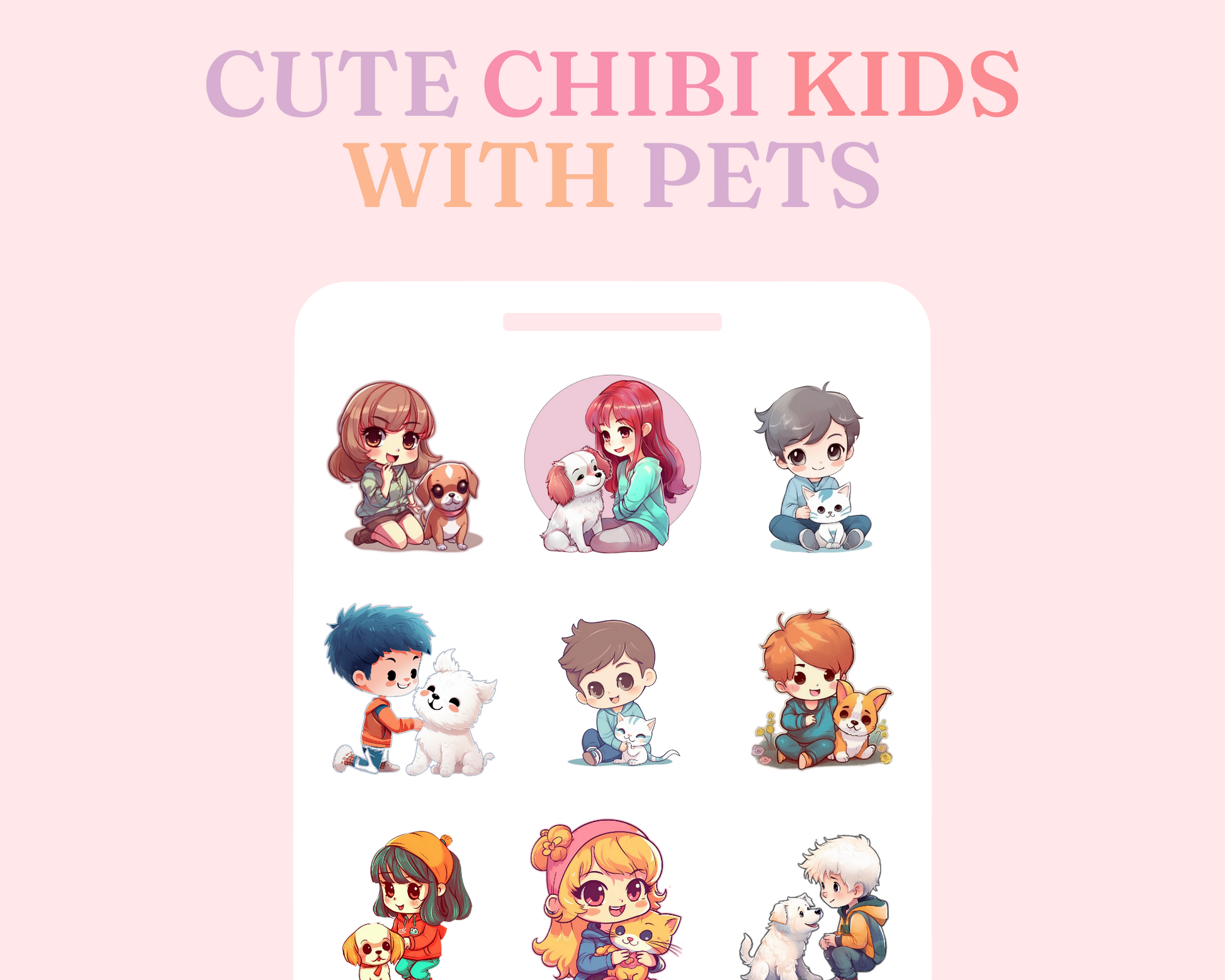 Cute Chibi Kids with Pets Stickers Clipart –Printable – Instant Download – High-Quality PNG - Transparent Background - Commercial Use