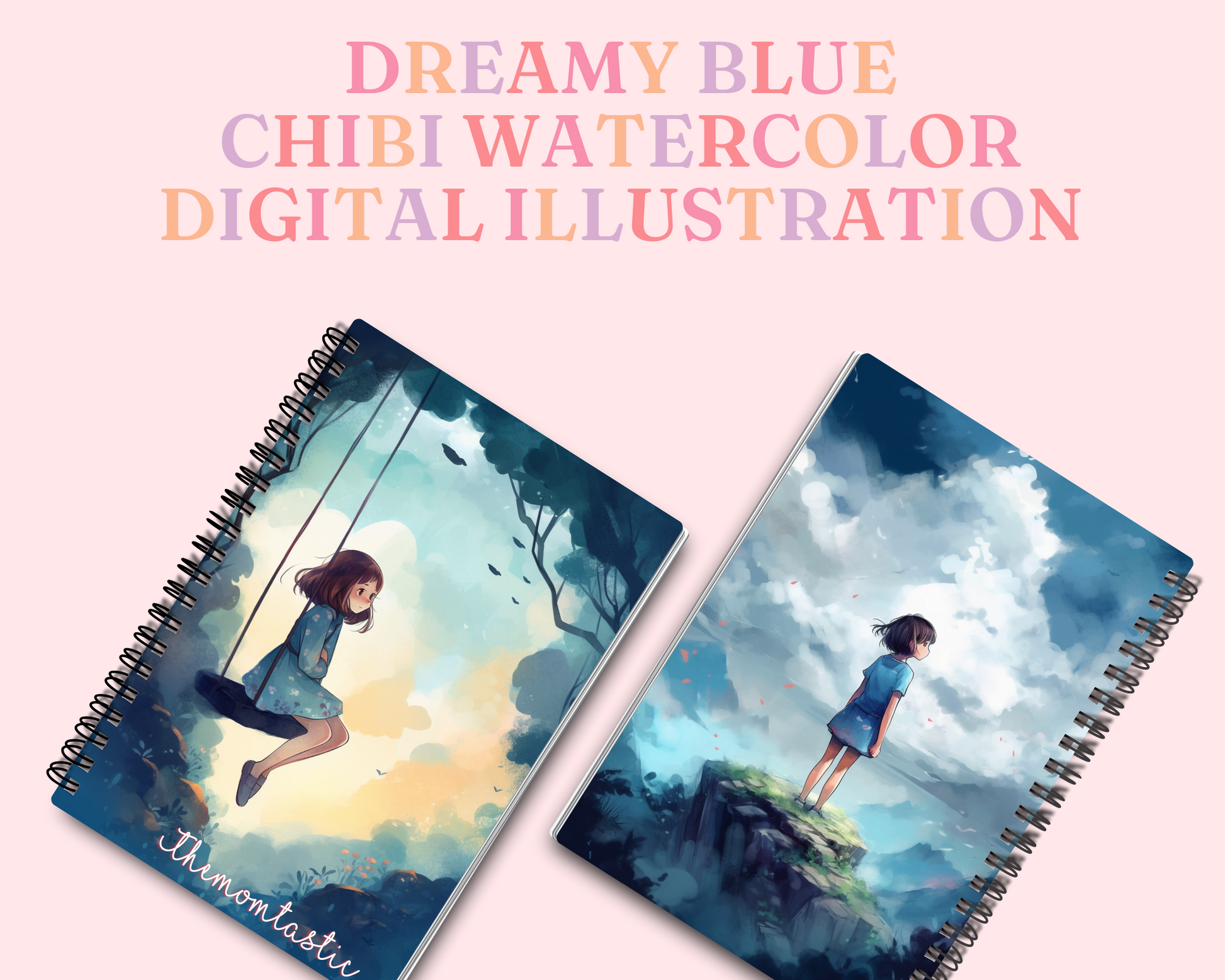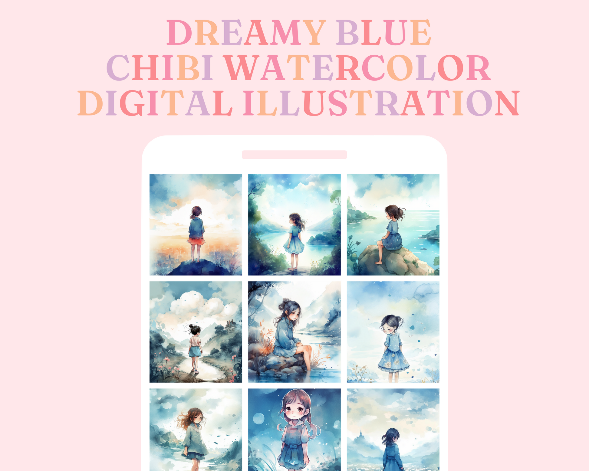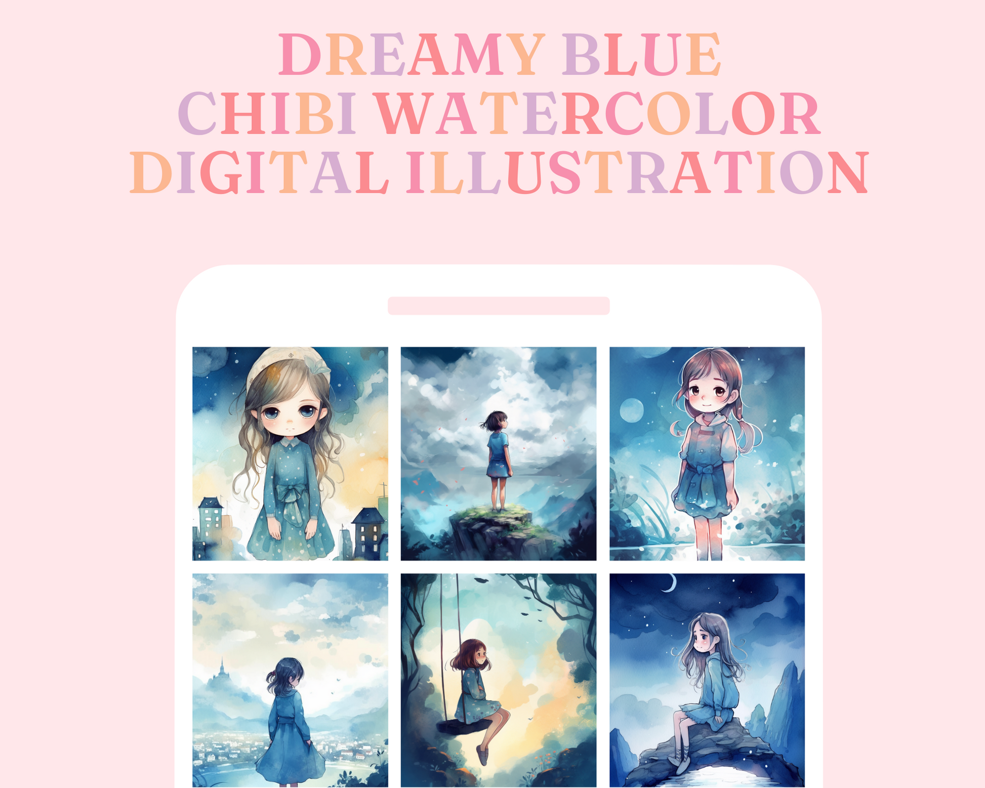 Dreamy Blue Chibi Watercolor Digital Illustration - Commercial Use
