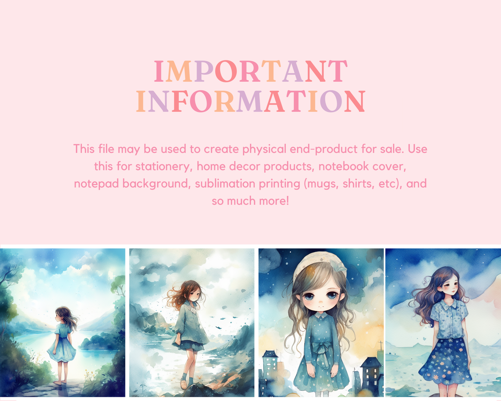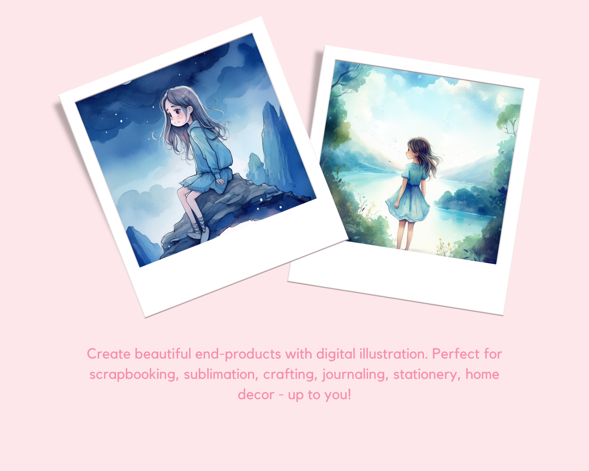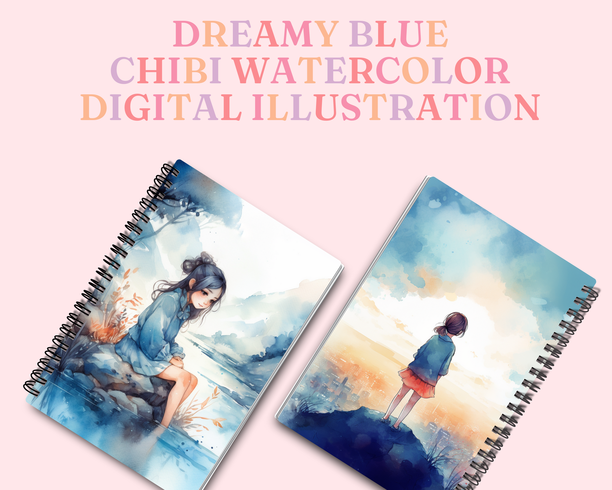 Dreamy Blue Chibi Watercolor Digital Illustration - Commercial Use