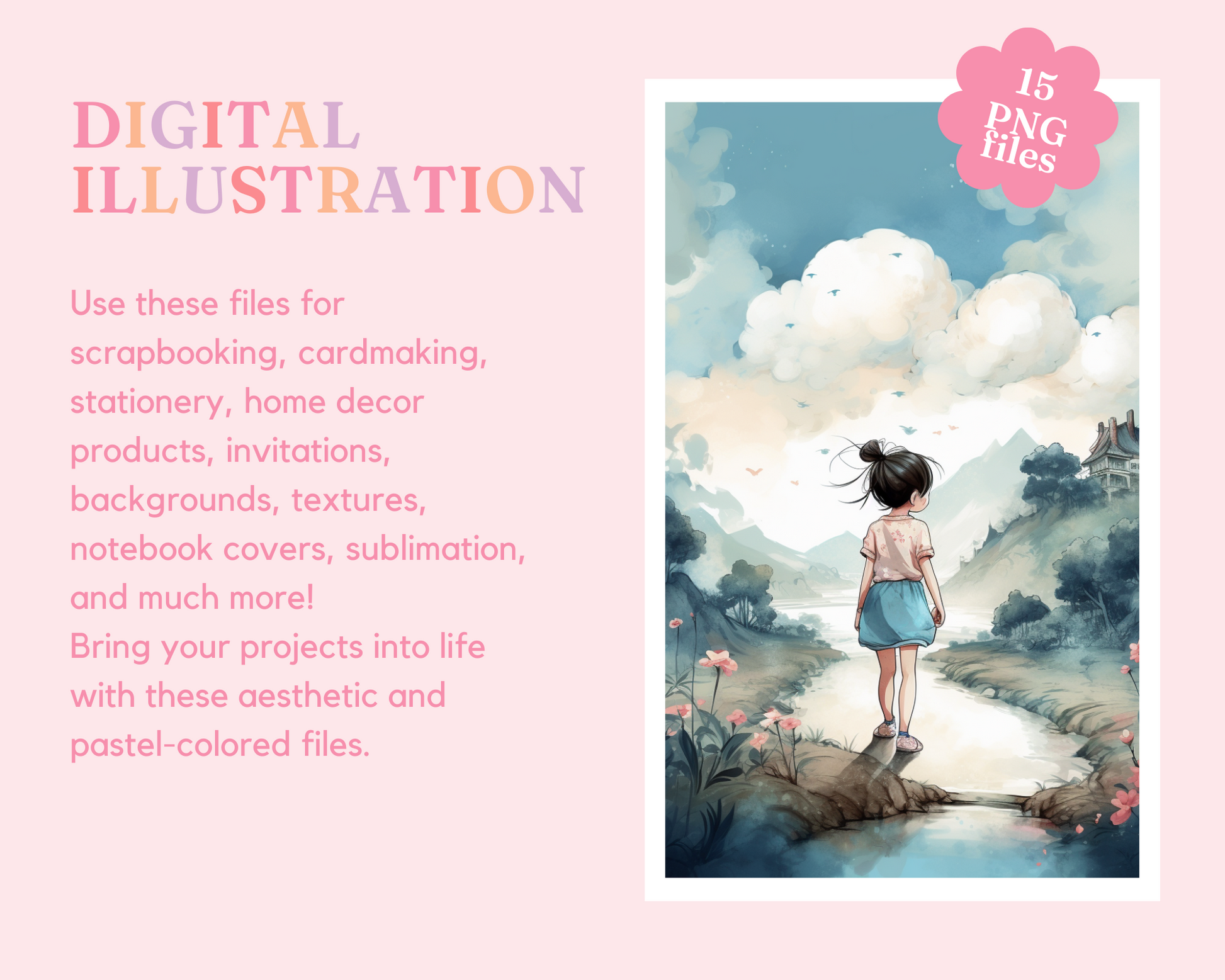 Our collection showcases a series of graceful, hand-drawn characters, each exuding confidence, and poise. Paired with mesmerizing scenic backgrounds, these illustrations are sure to captivate your audience and add a touch of glamour to your projects.