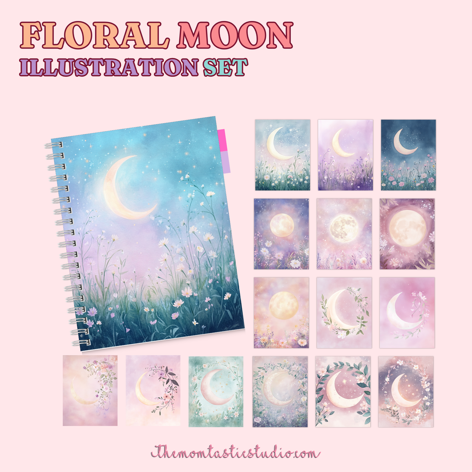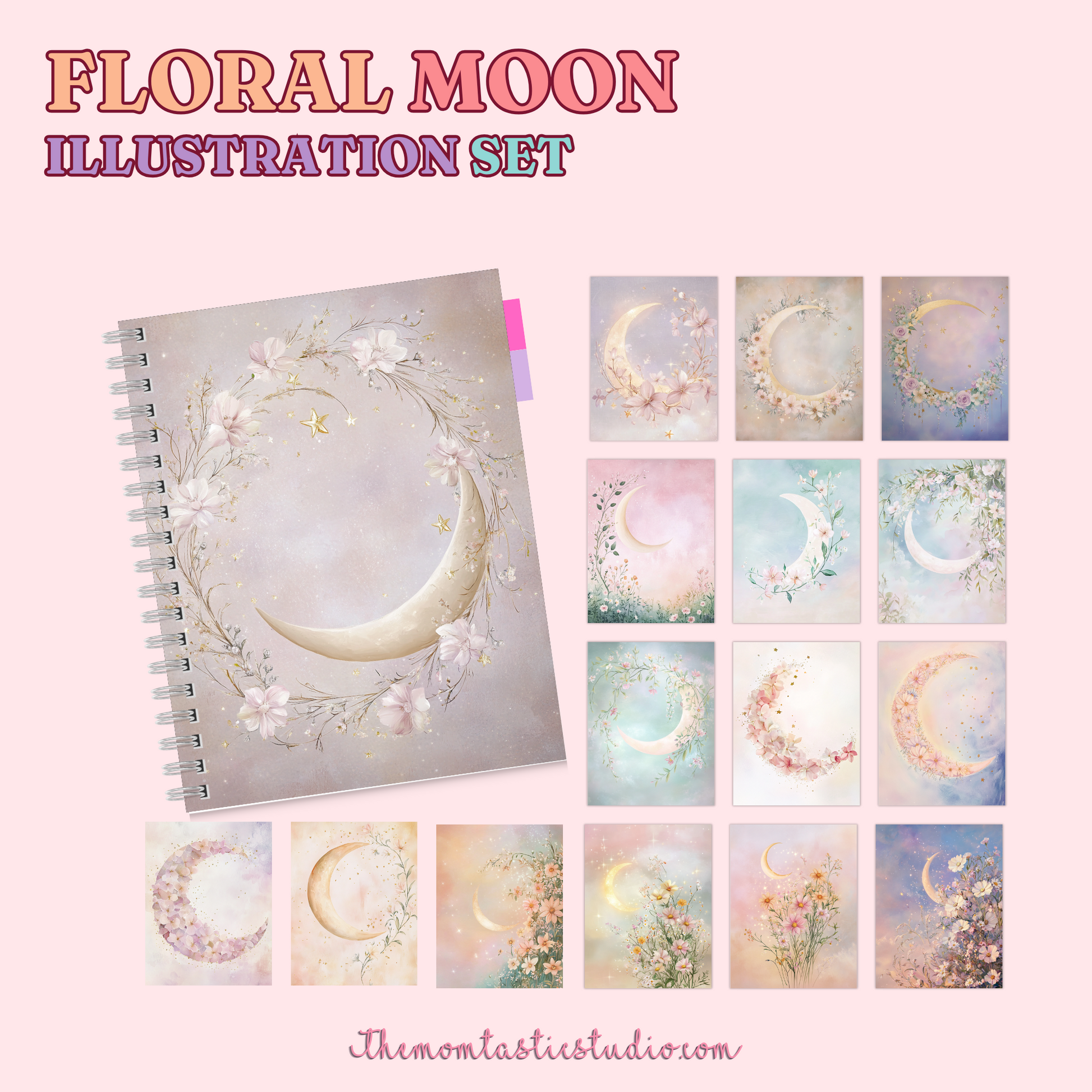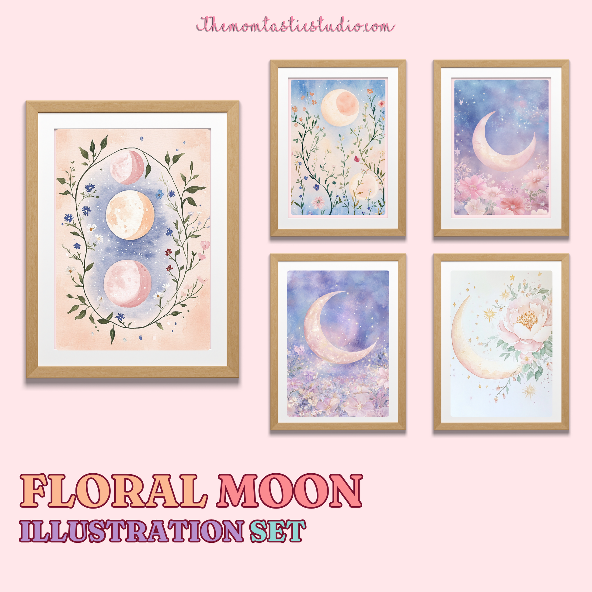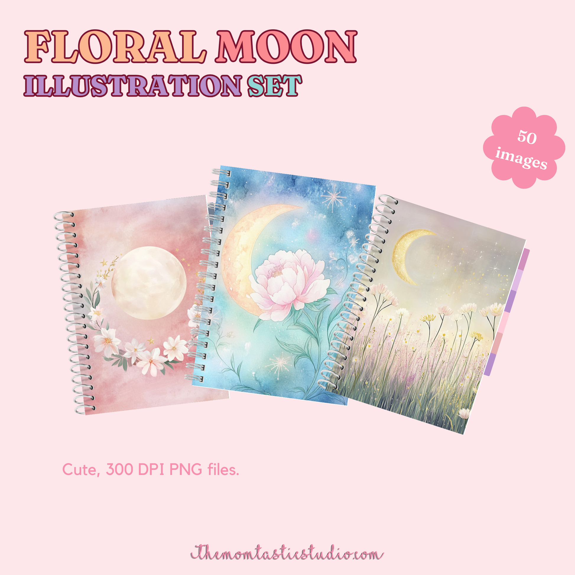 Floral Moon Illustration Set - 300 DPI – Instant Download – Commercial Use