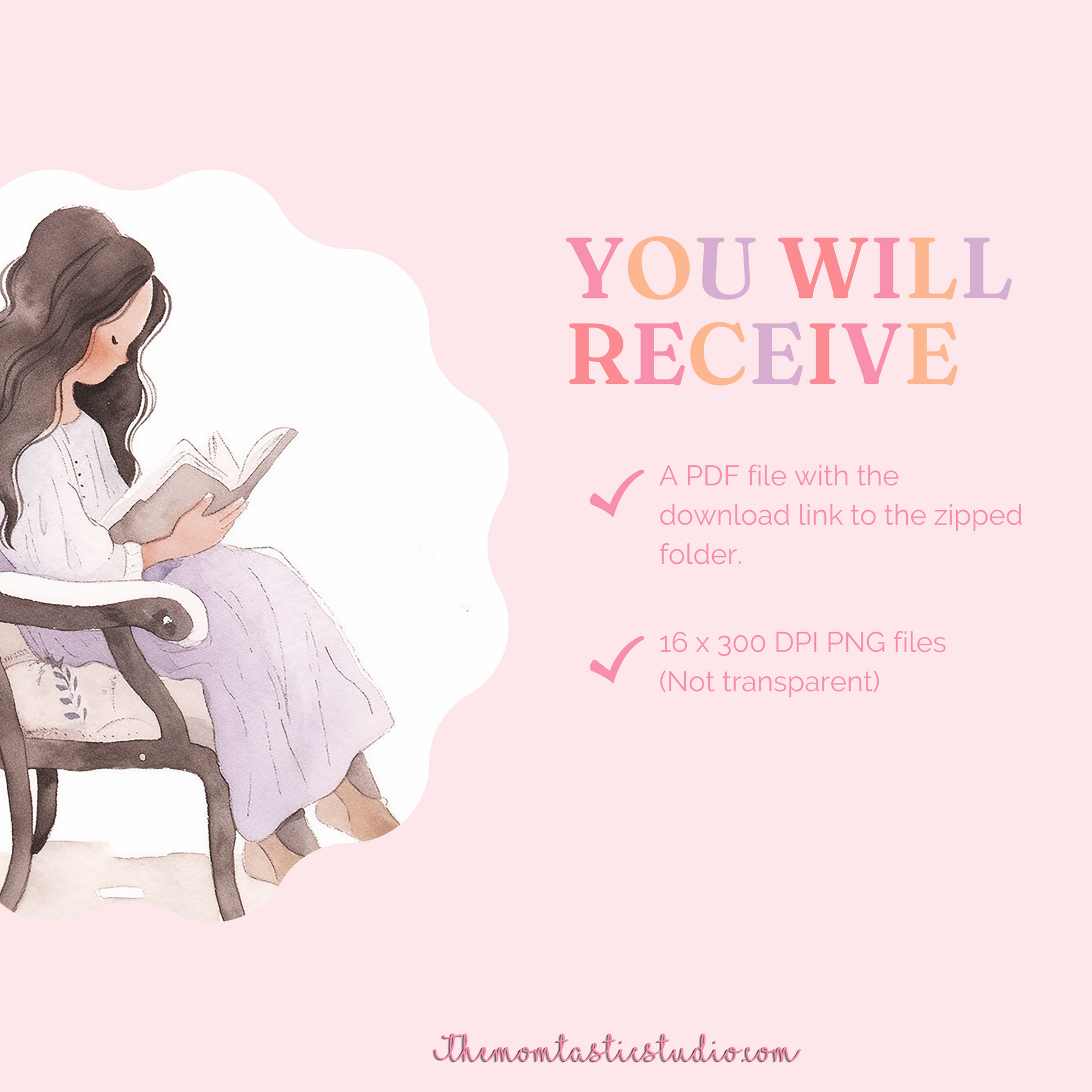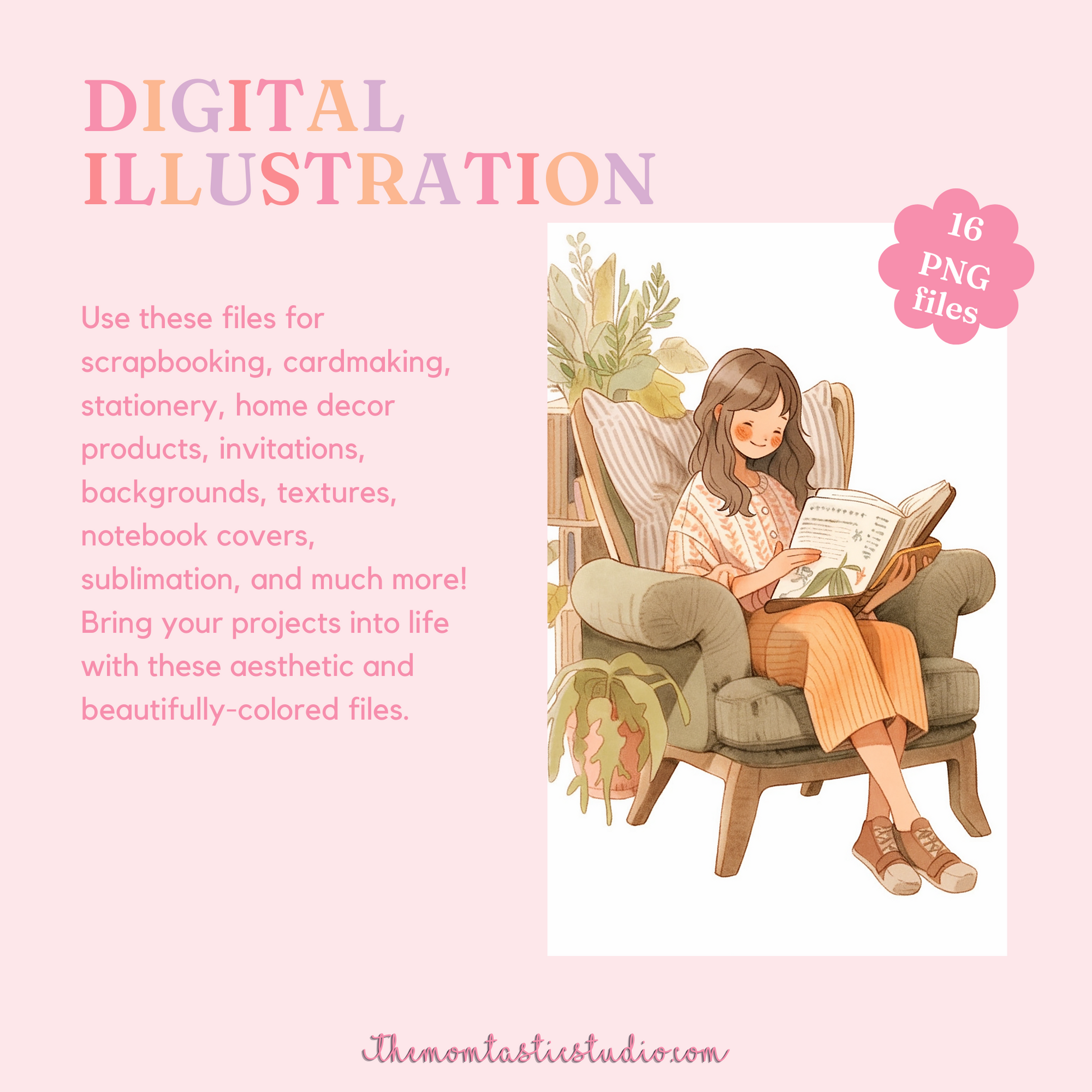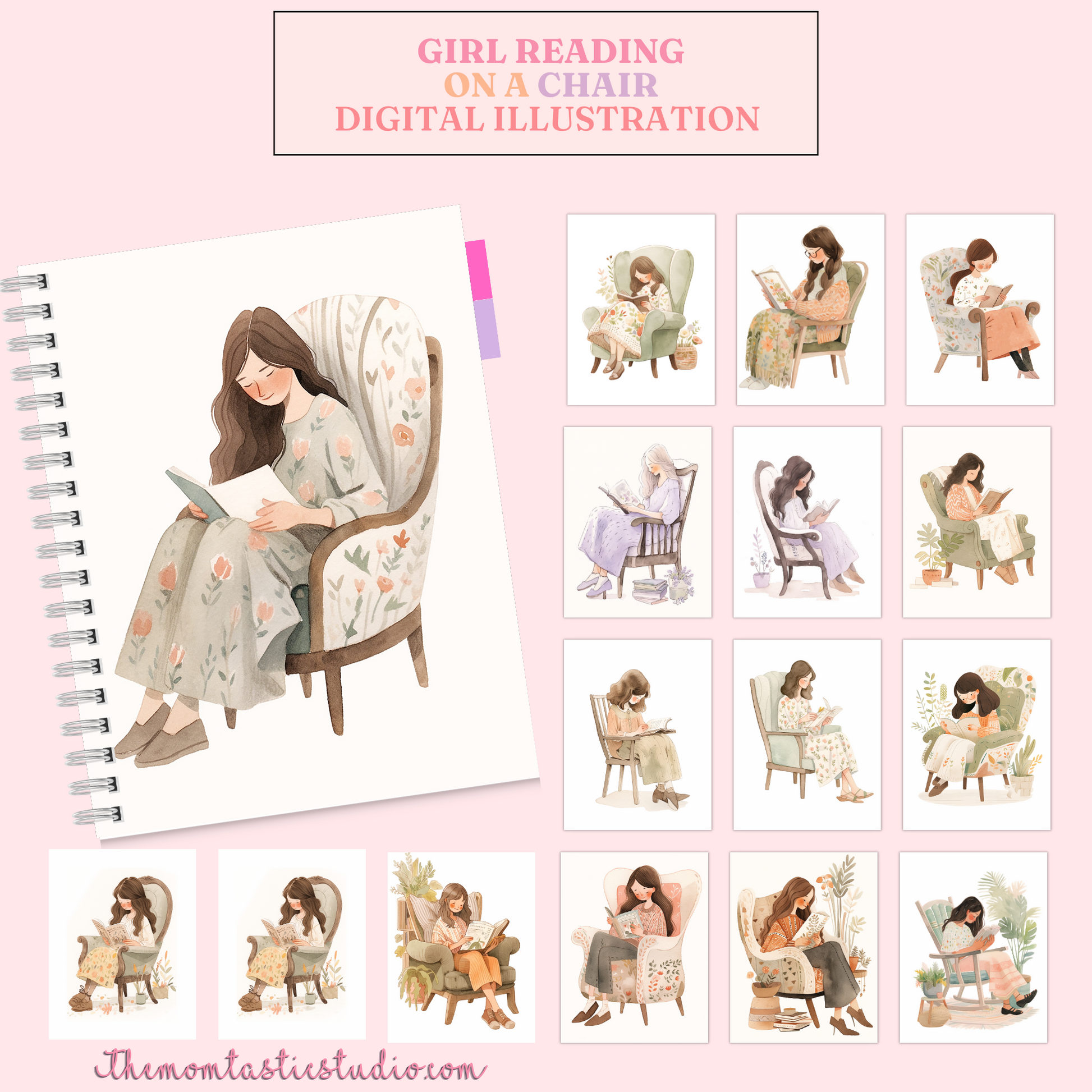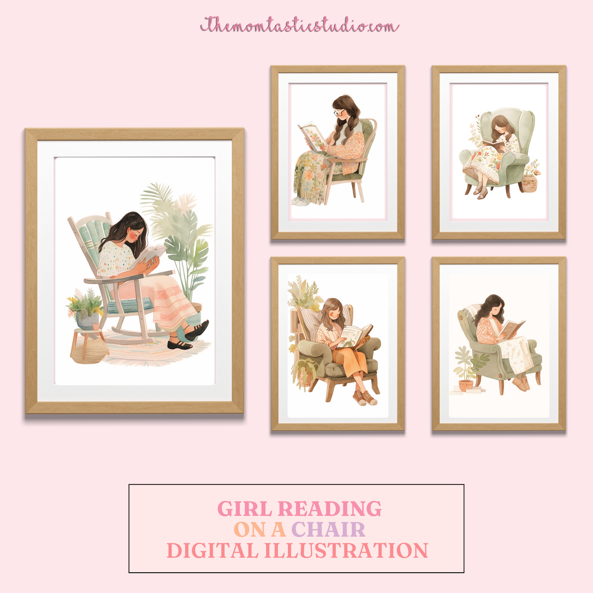 Girl Reading on a Chair Digital Illustration 300DPI – Instant Download – Commercial Use