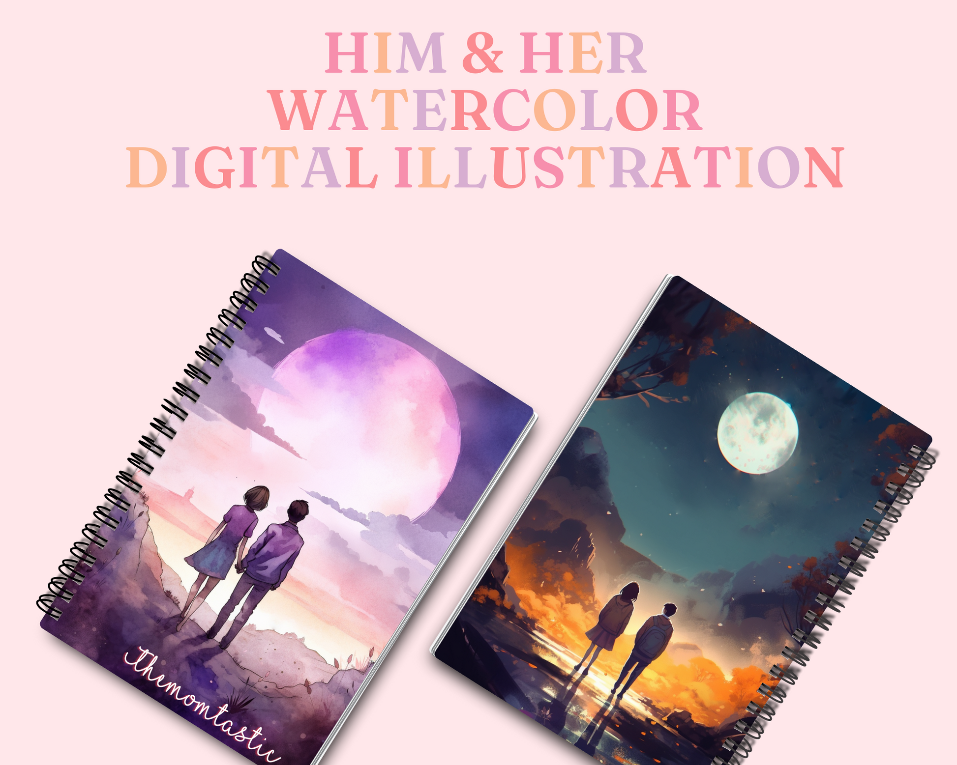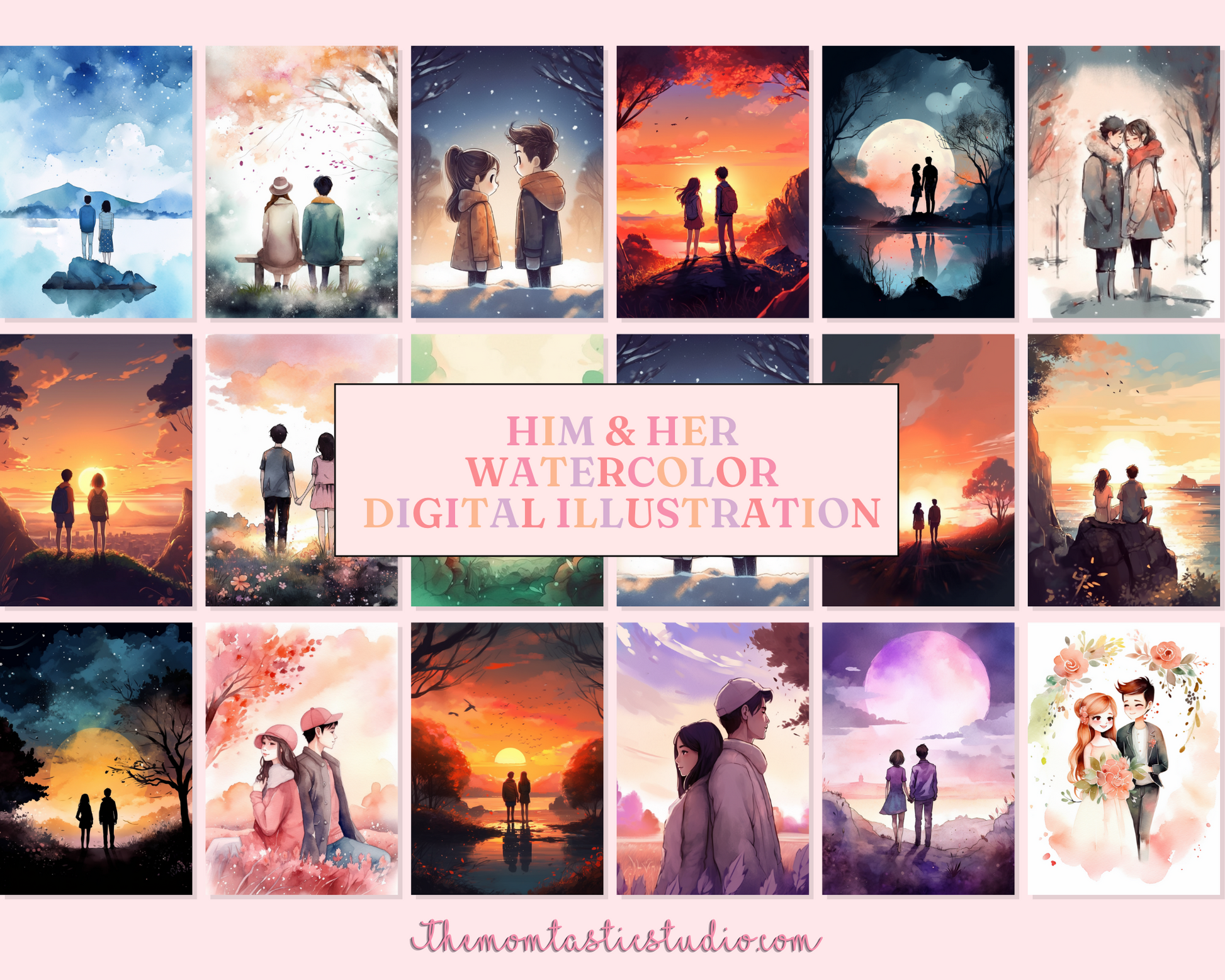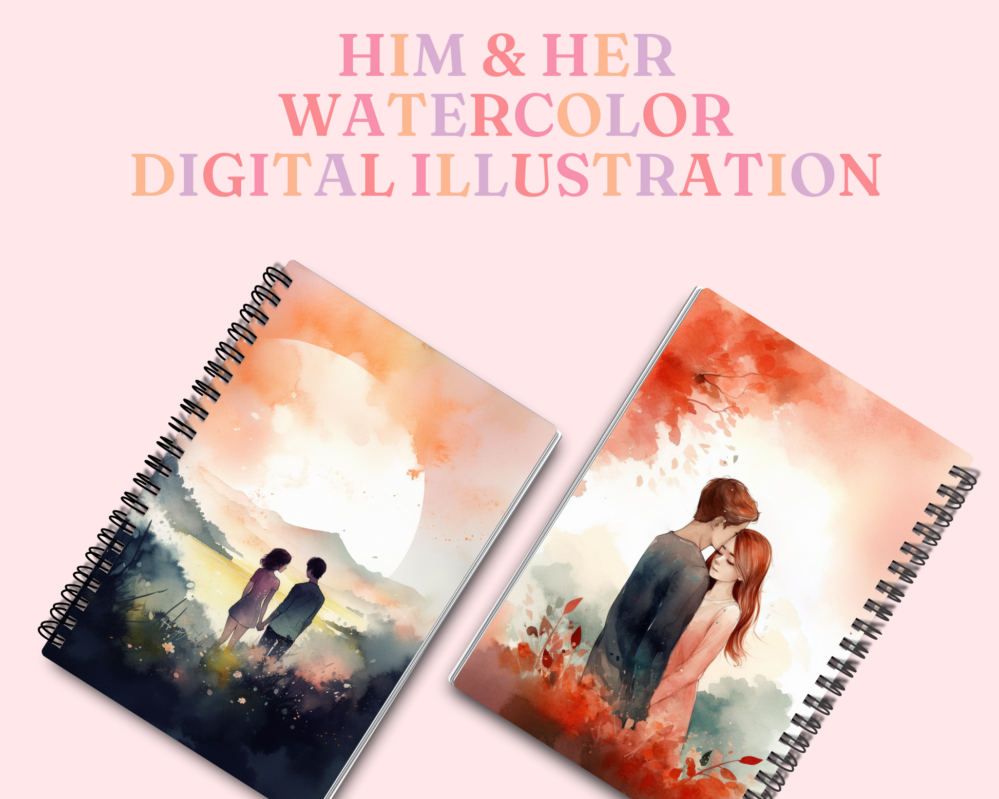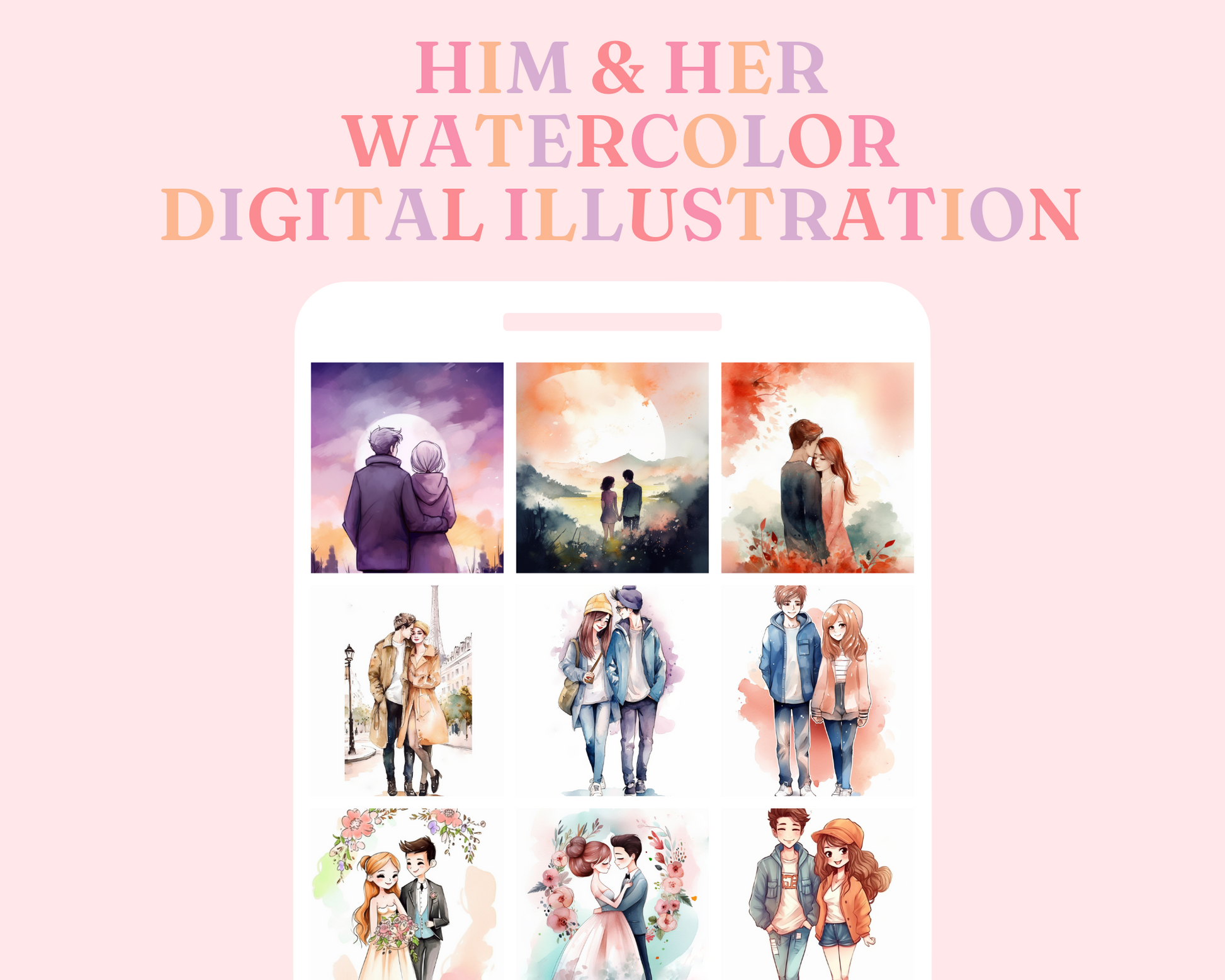 Him and Her Beautiful Watercolor Digital Illustration - Commercial Use - Pretty - Instant Download