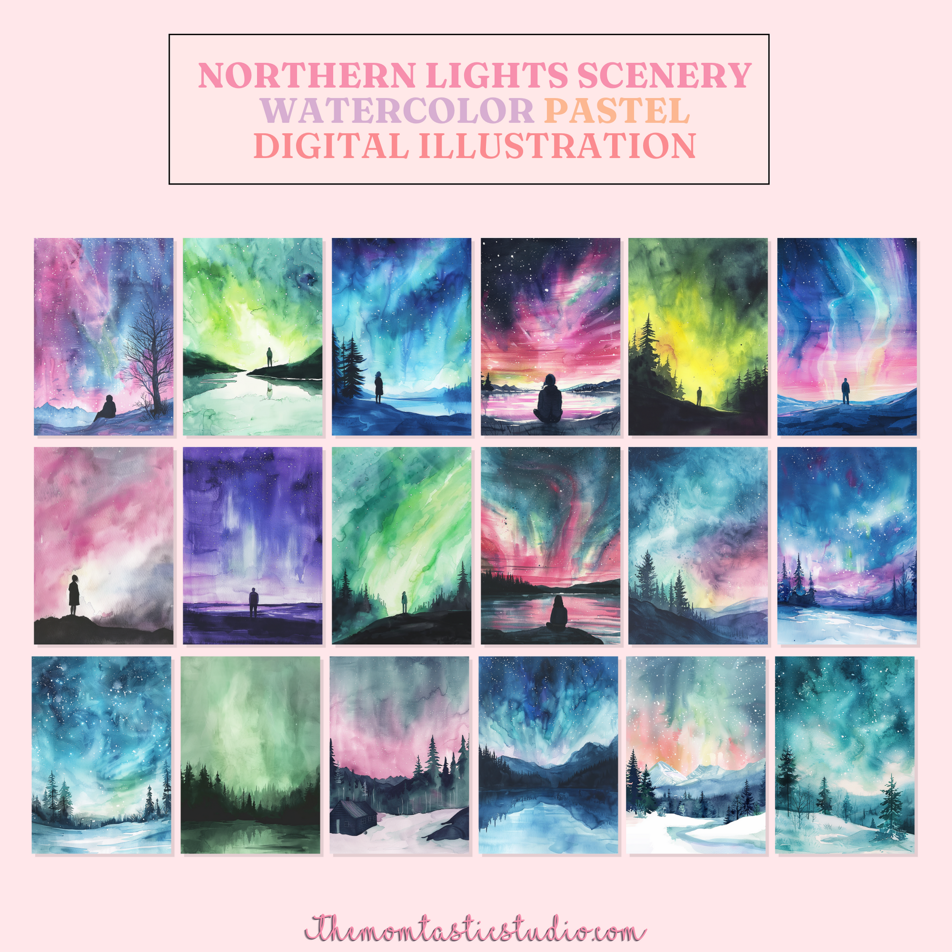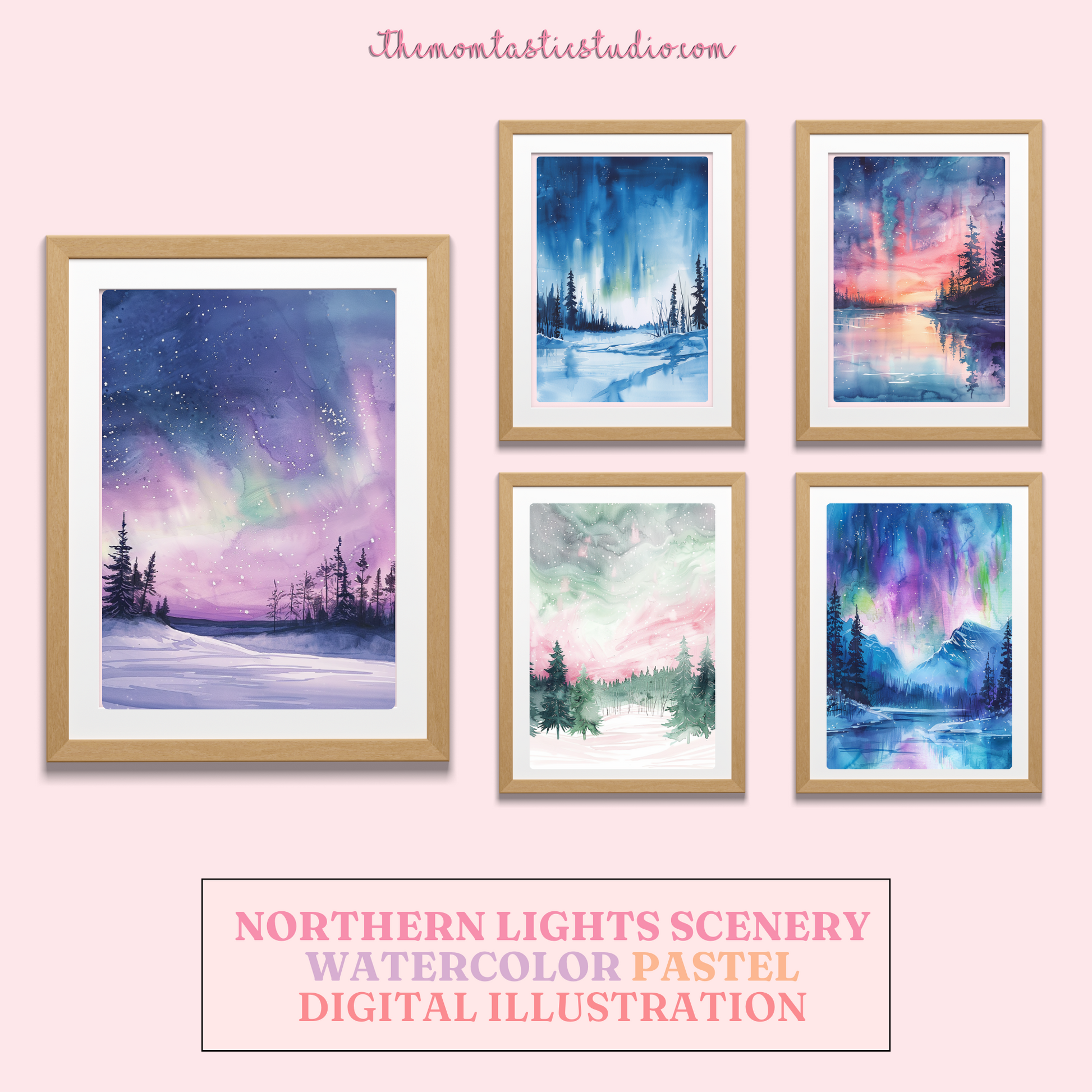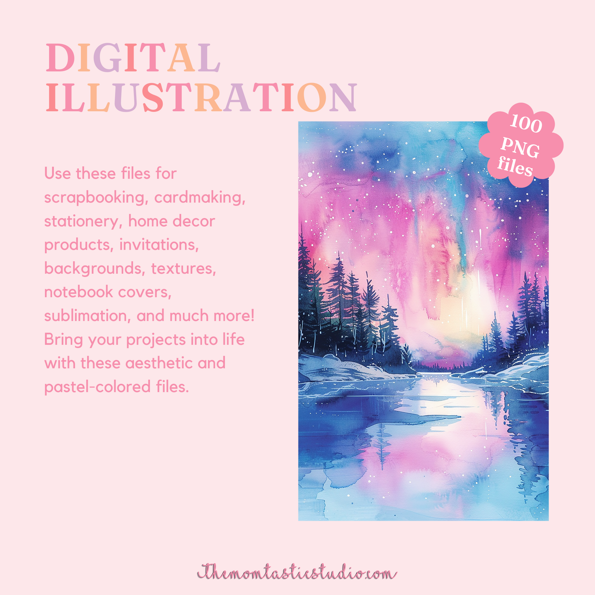 Northern Lights Scenery Watercolor Pastel Digital Illustration 300DPI – Instant Download – Commercial Use