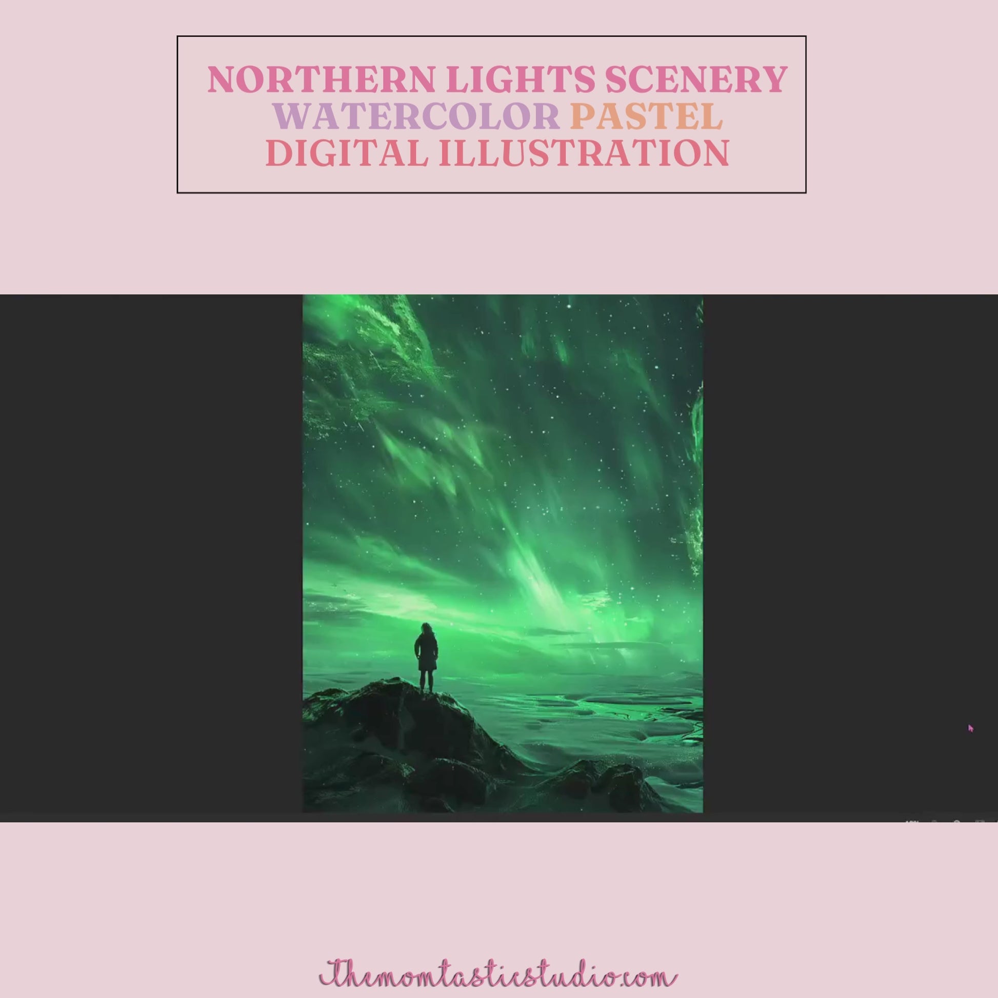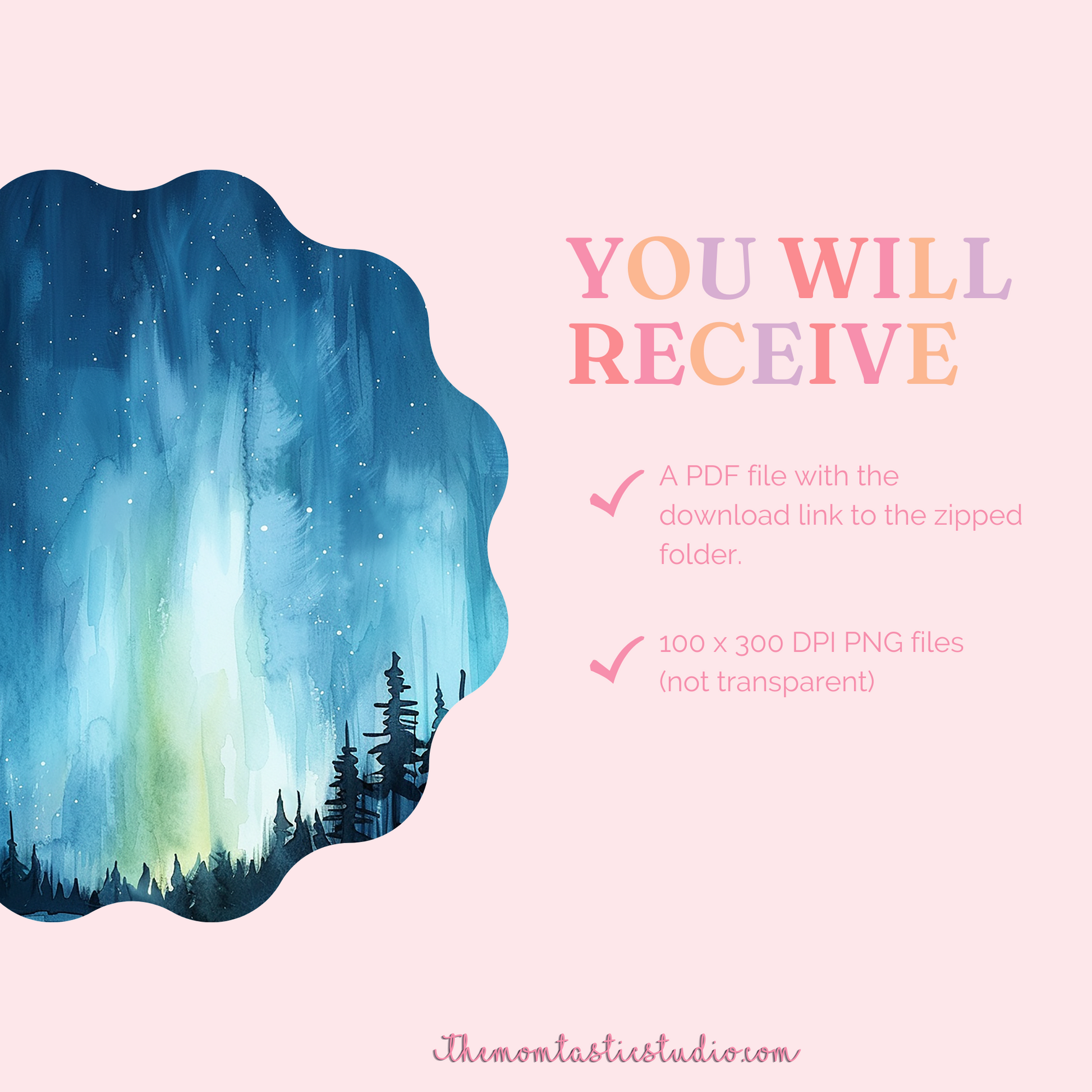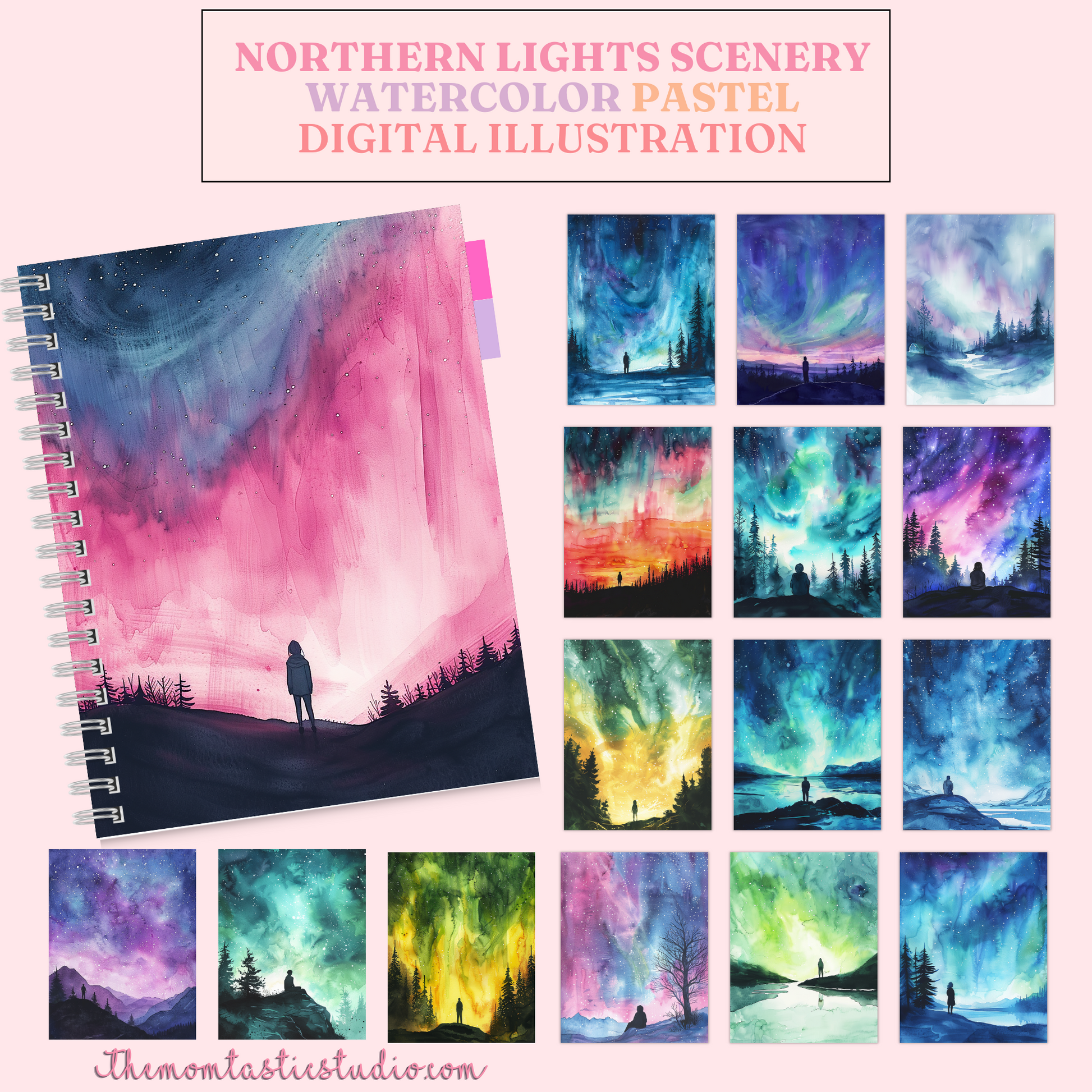 Northern Lights Scenery Watercolor Pastel Digital Illustration 300DPI – Instant Download – Commercial Use
