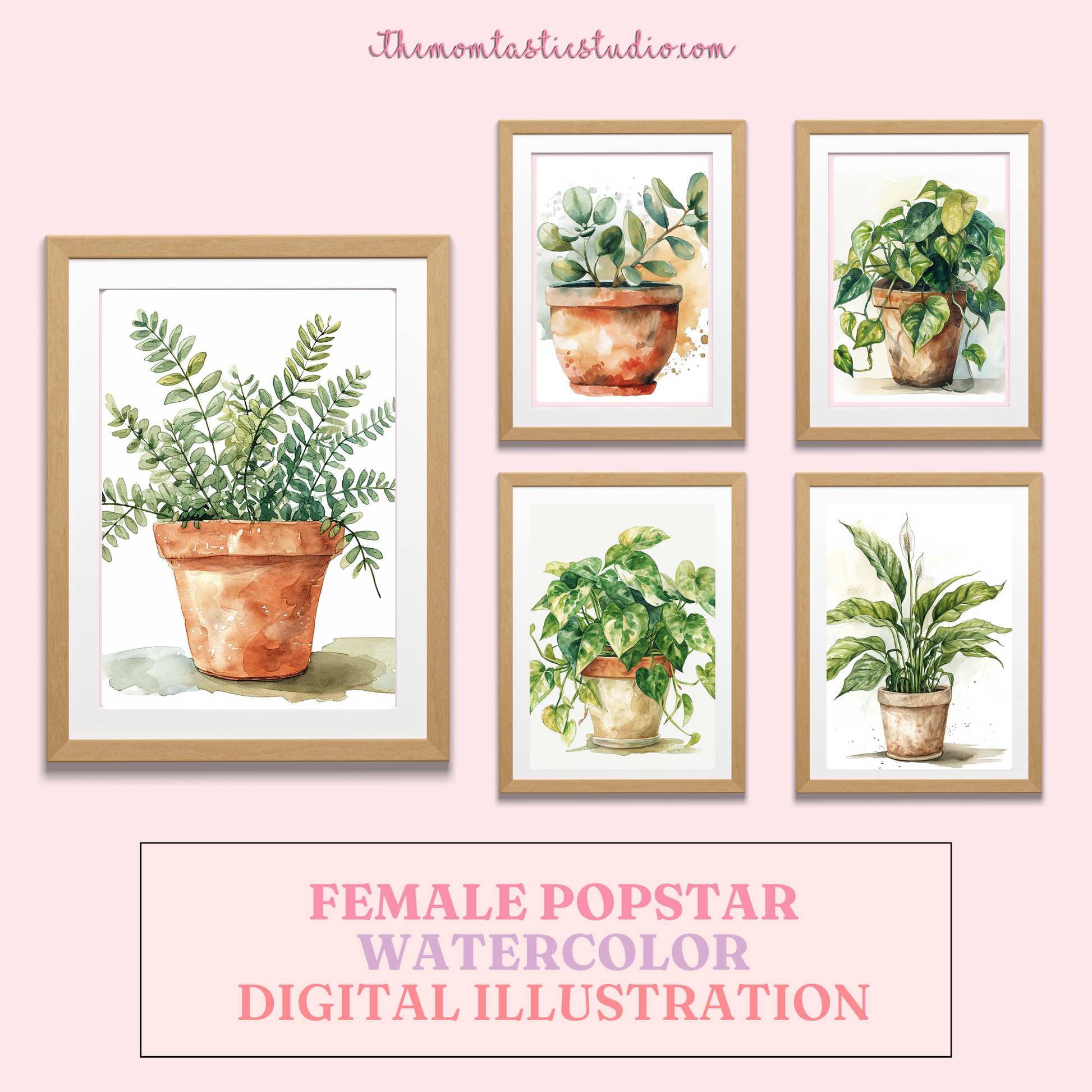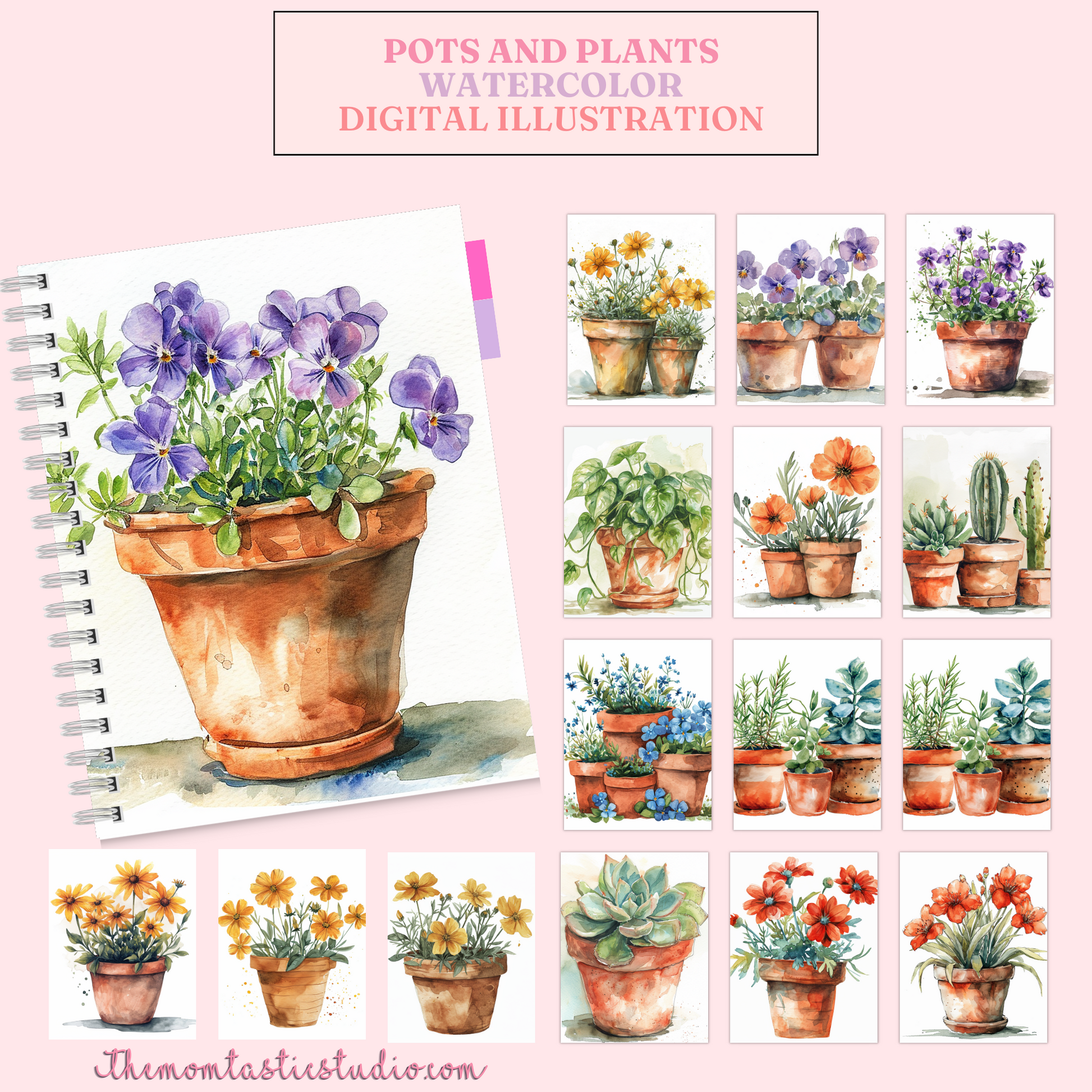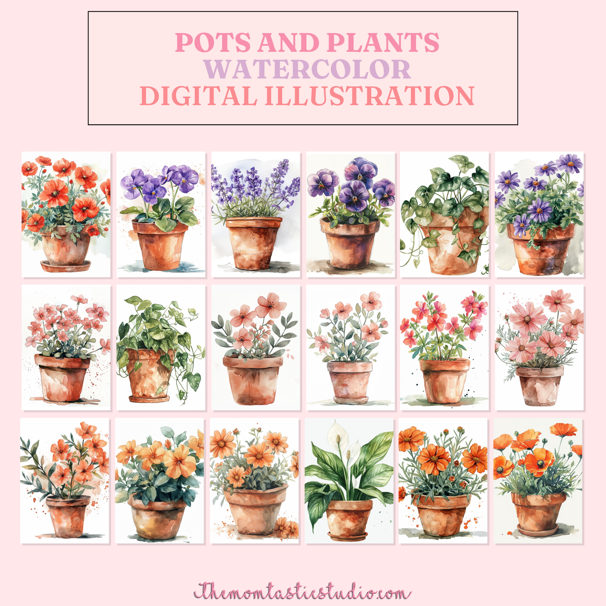 Pots and Plants Watercolor Digital Illustration 300DPI – Instant Download – Commercial Use