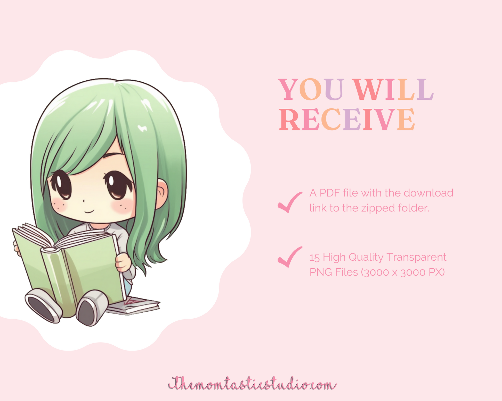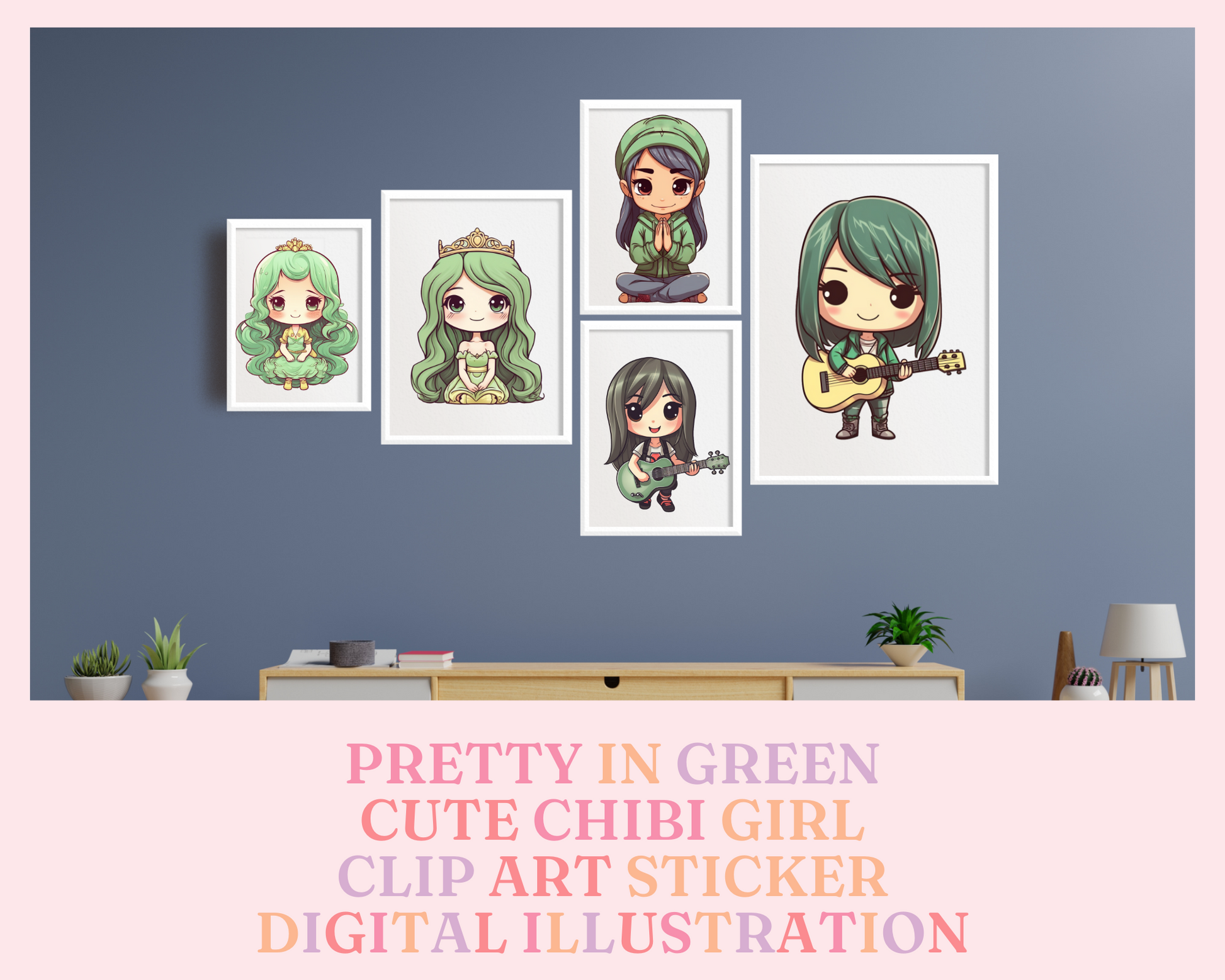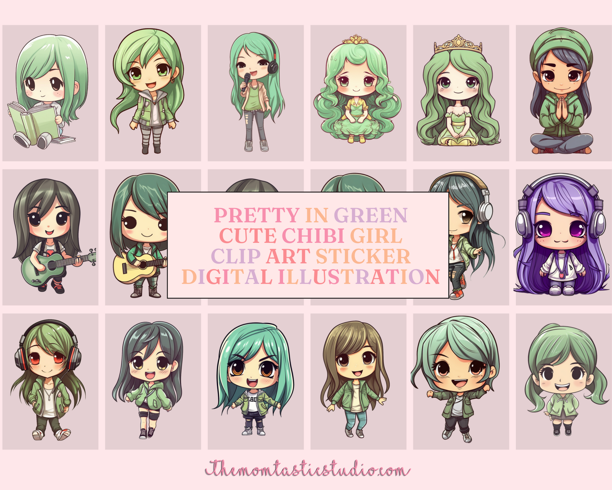 Pretty in Green Chibi Girls Stickers Clipart – Printable – Instant Download – High-Quality PNG - Transparent Background - Commercial Use