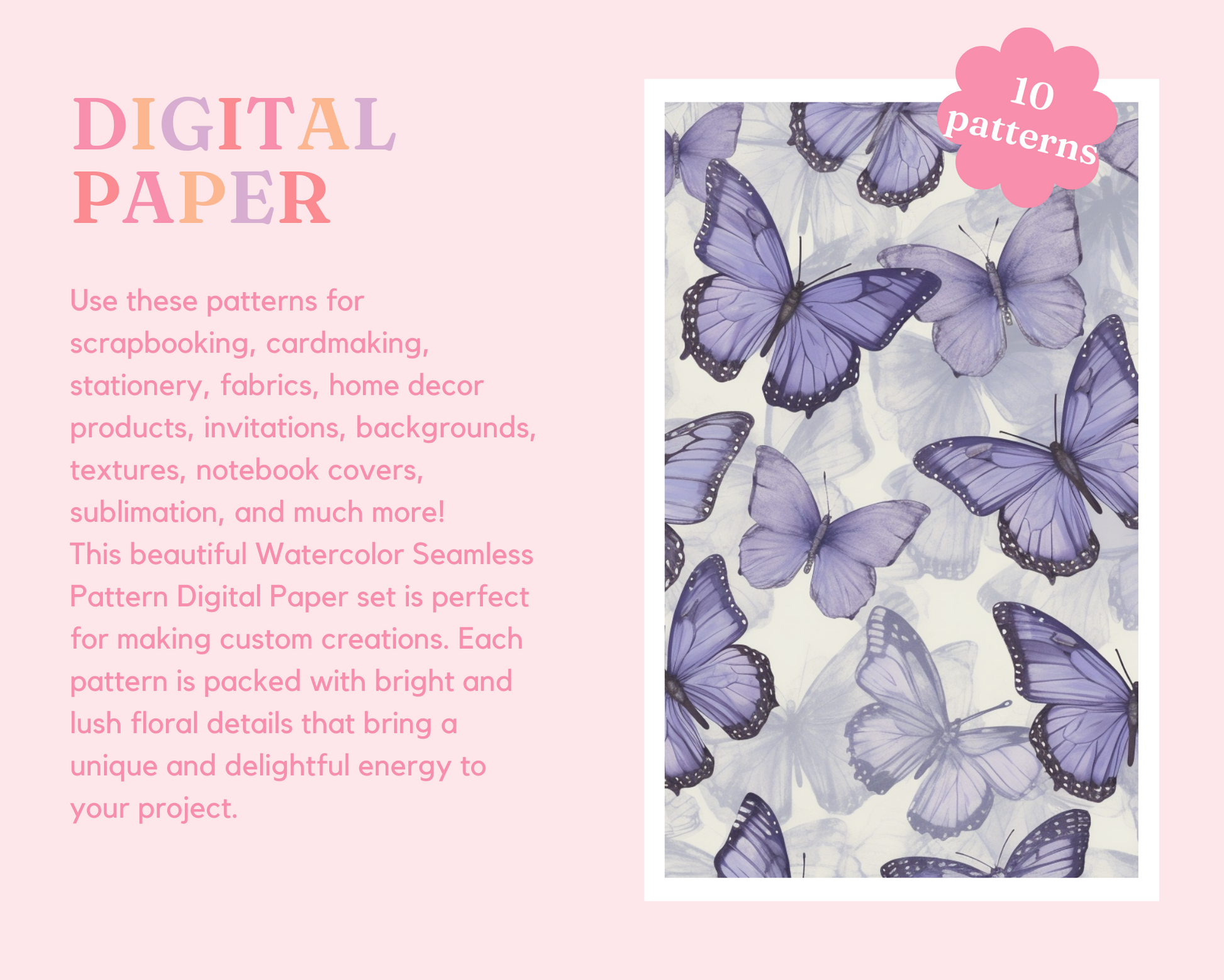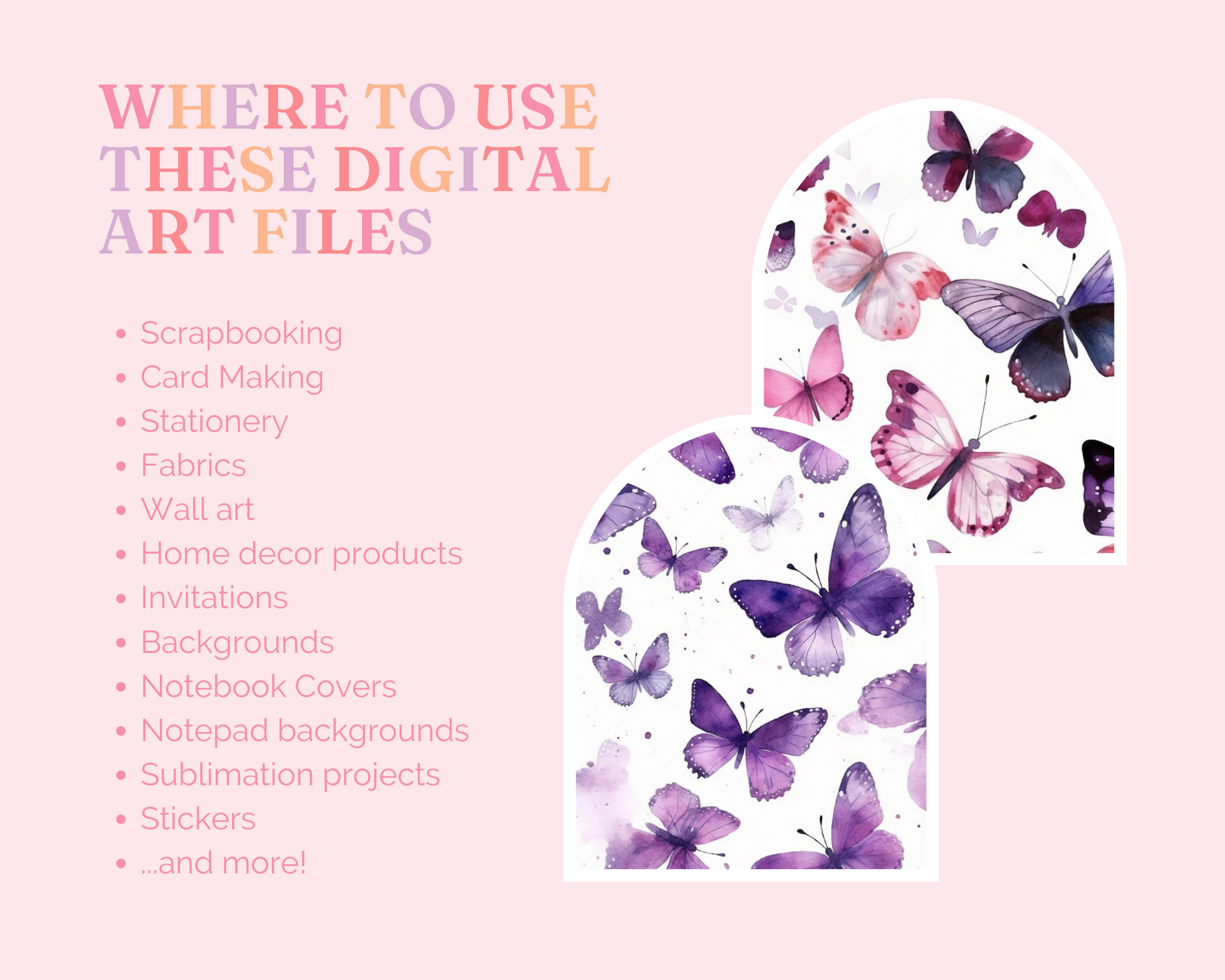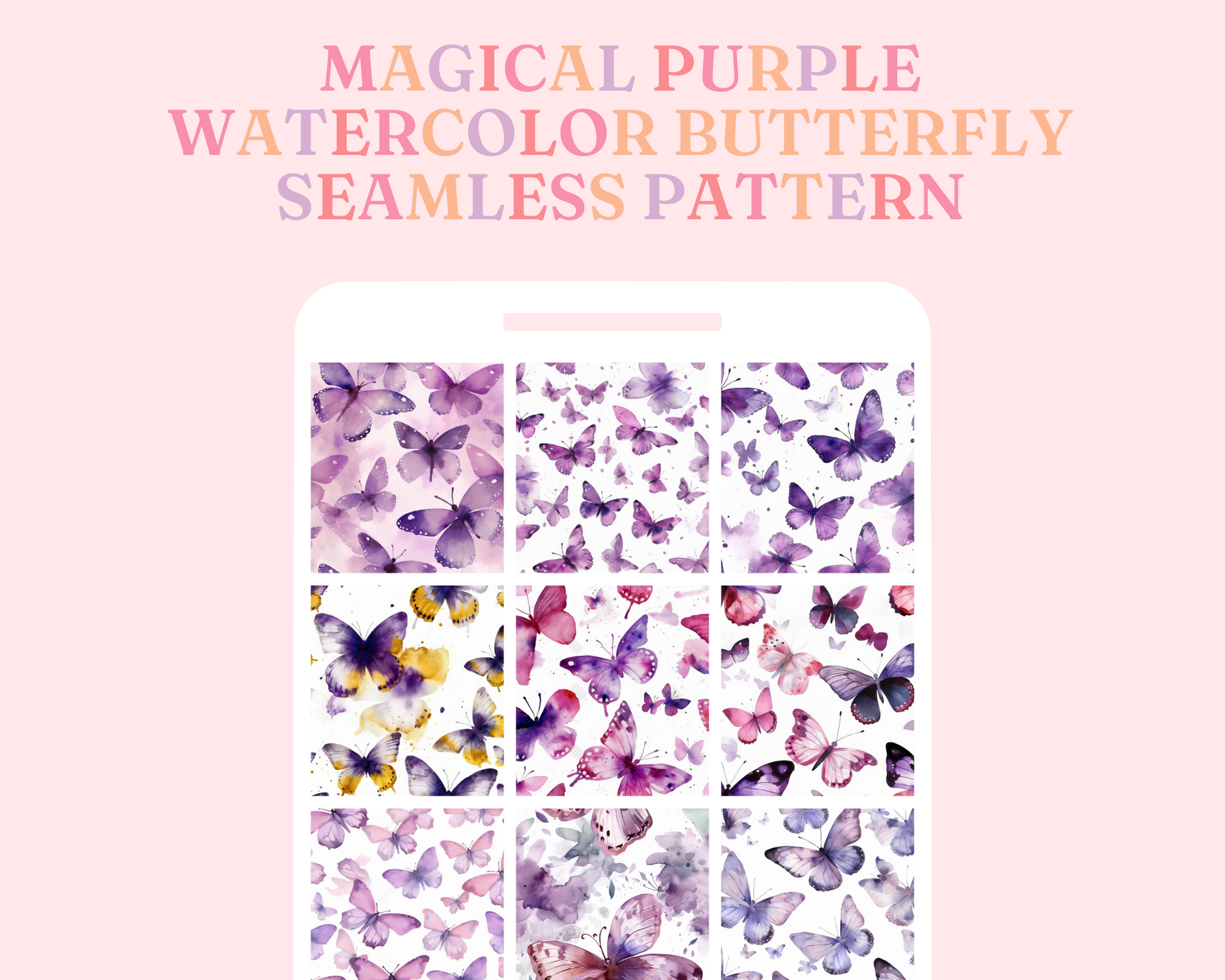 ✨ Infuse your creative projects with the whimsical charm of our Purple Butterfly Seamless Pattern. Featuring enchanting watercolor patterns with delicate purple pastel butterflies, this set of digital papers is perfect for commercial use, adding a touch of wonder and magic to any project. Instantly download and start enhancing your work with these delightful designs! ✨