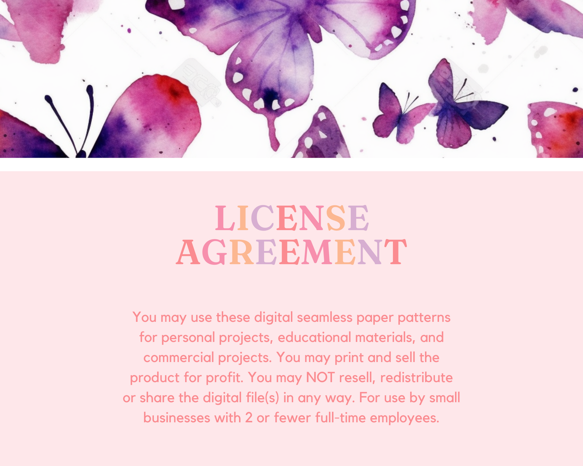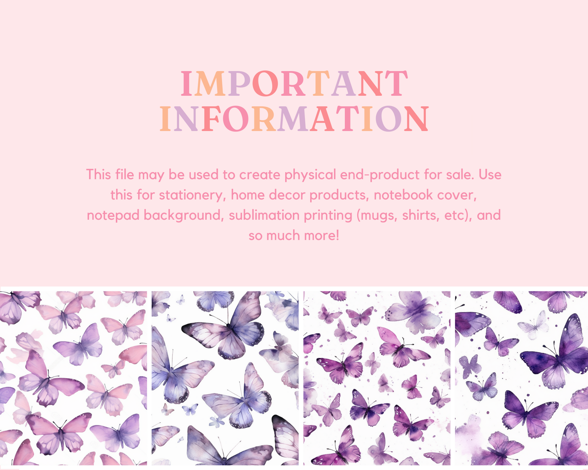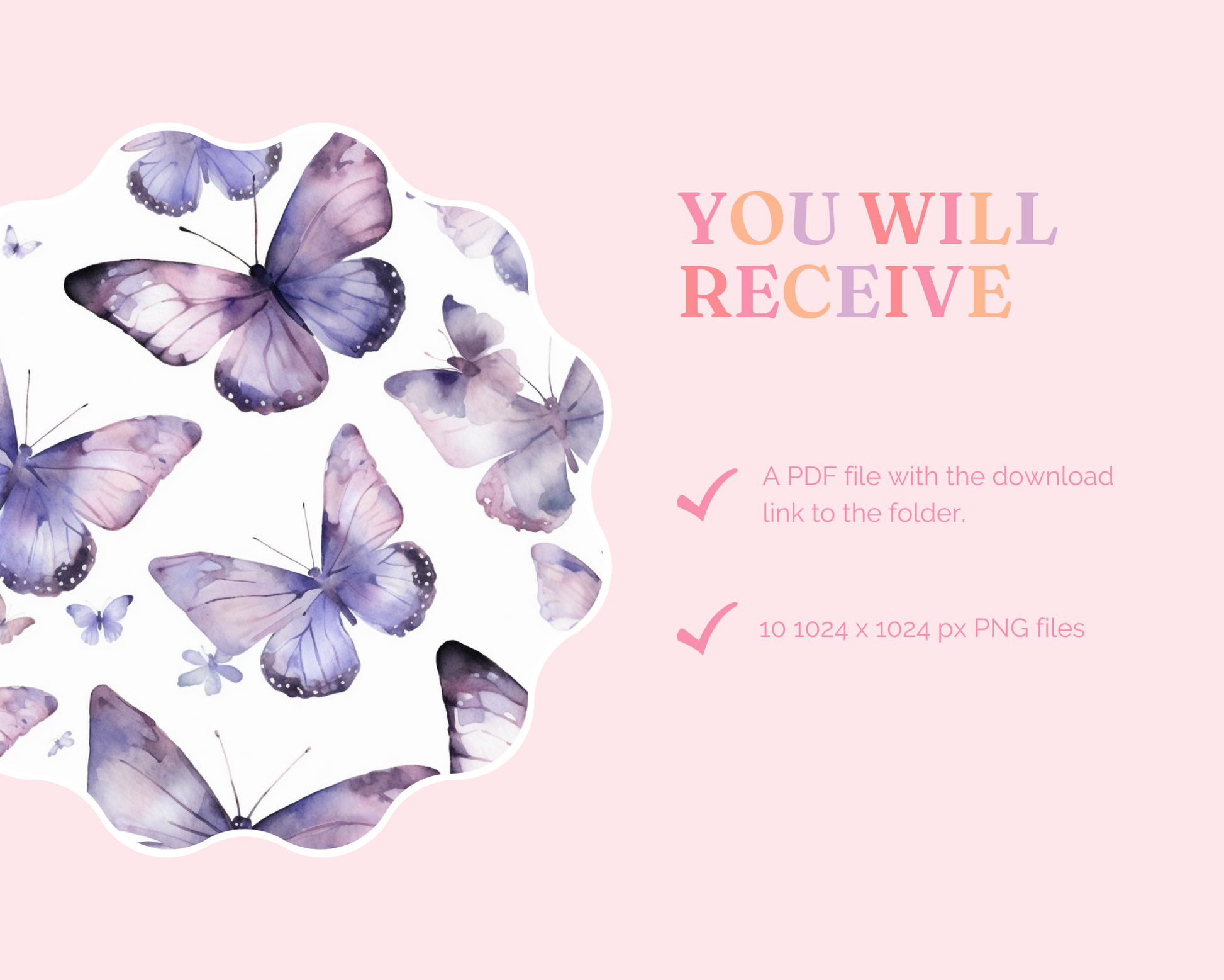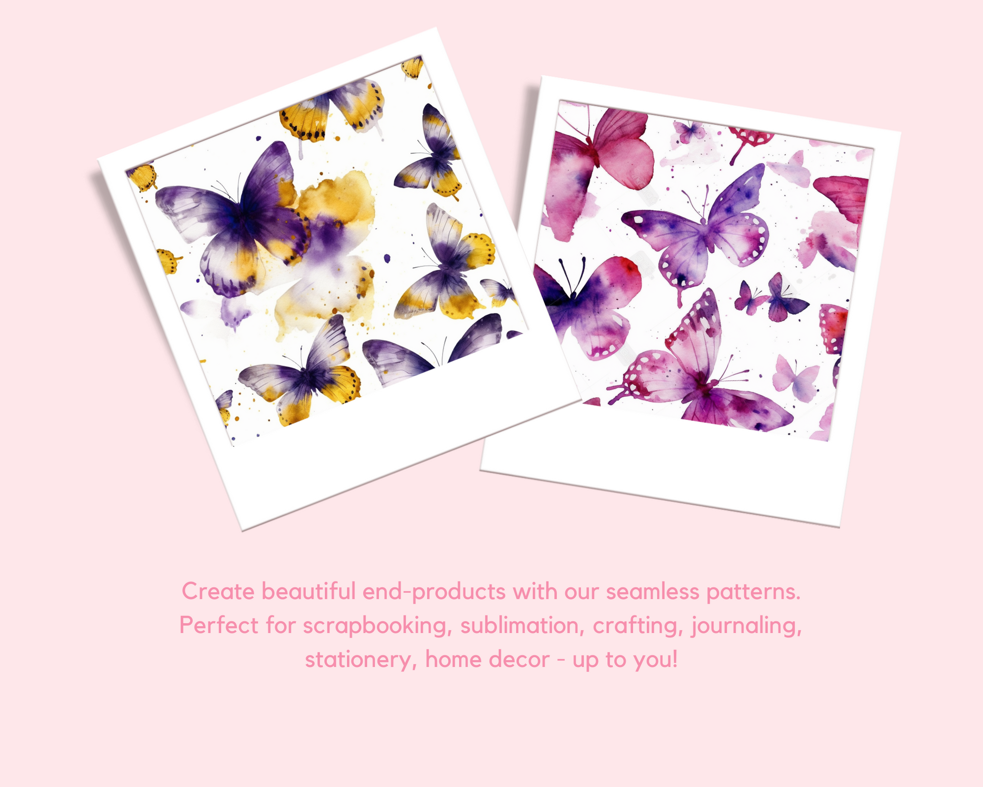 ✨ Infuse your creative projects with the whimsical charm of our Purple Butterfly Seamless Pattern. Featuring enchanting watercolor patterns with delicate purple pastel butterflies, this set of digital papers is perfect for commercial use, adding a touch of wonder and magic to any project. Instantly download and start enhancing your work with these delightful designs! ✨