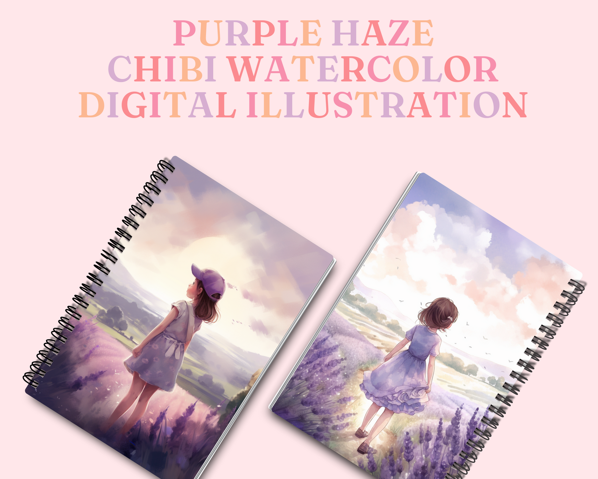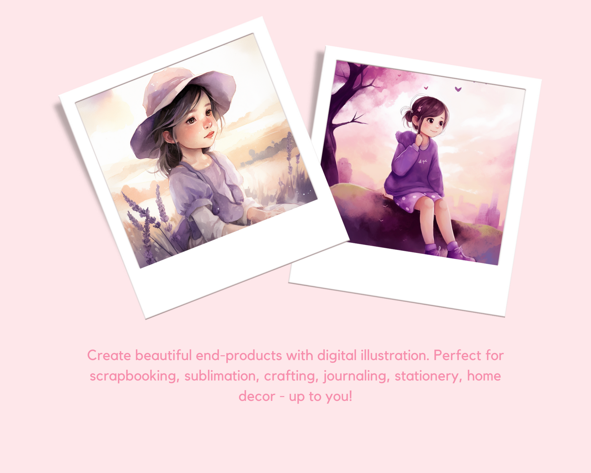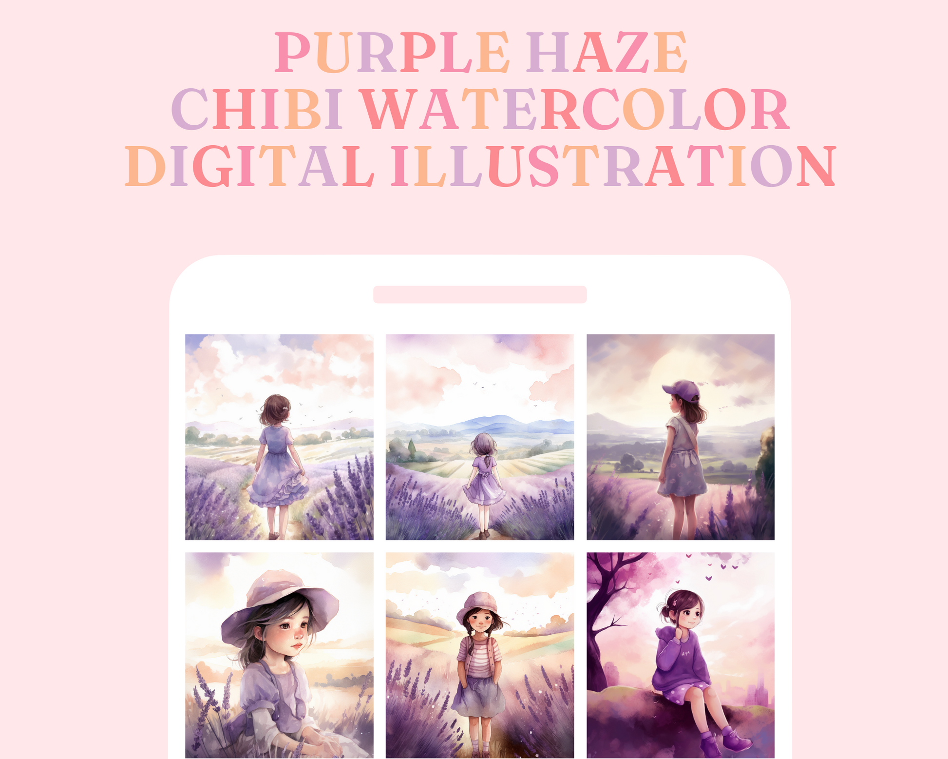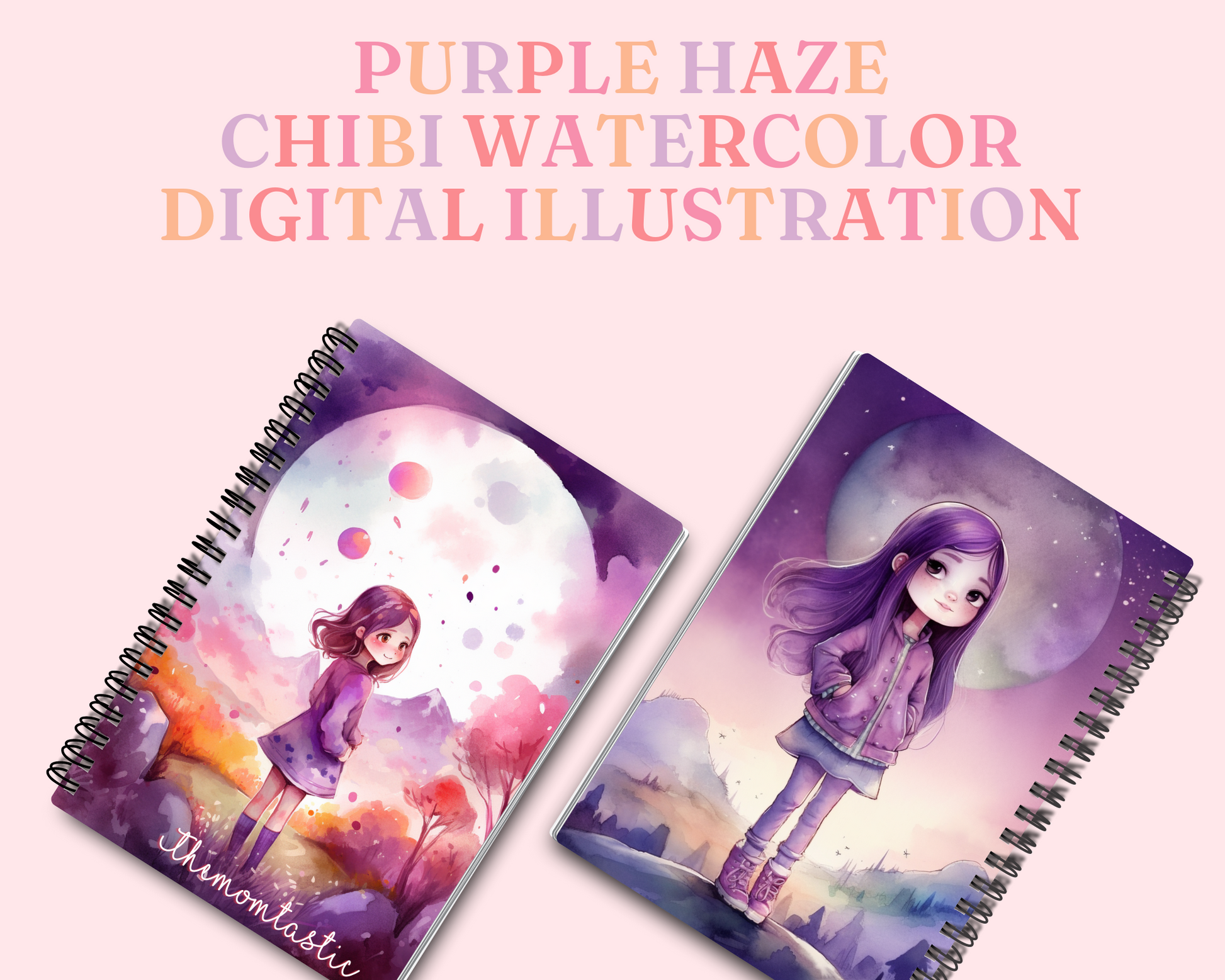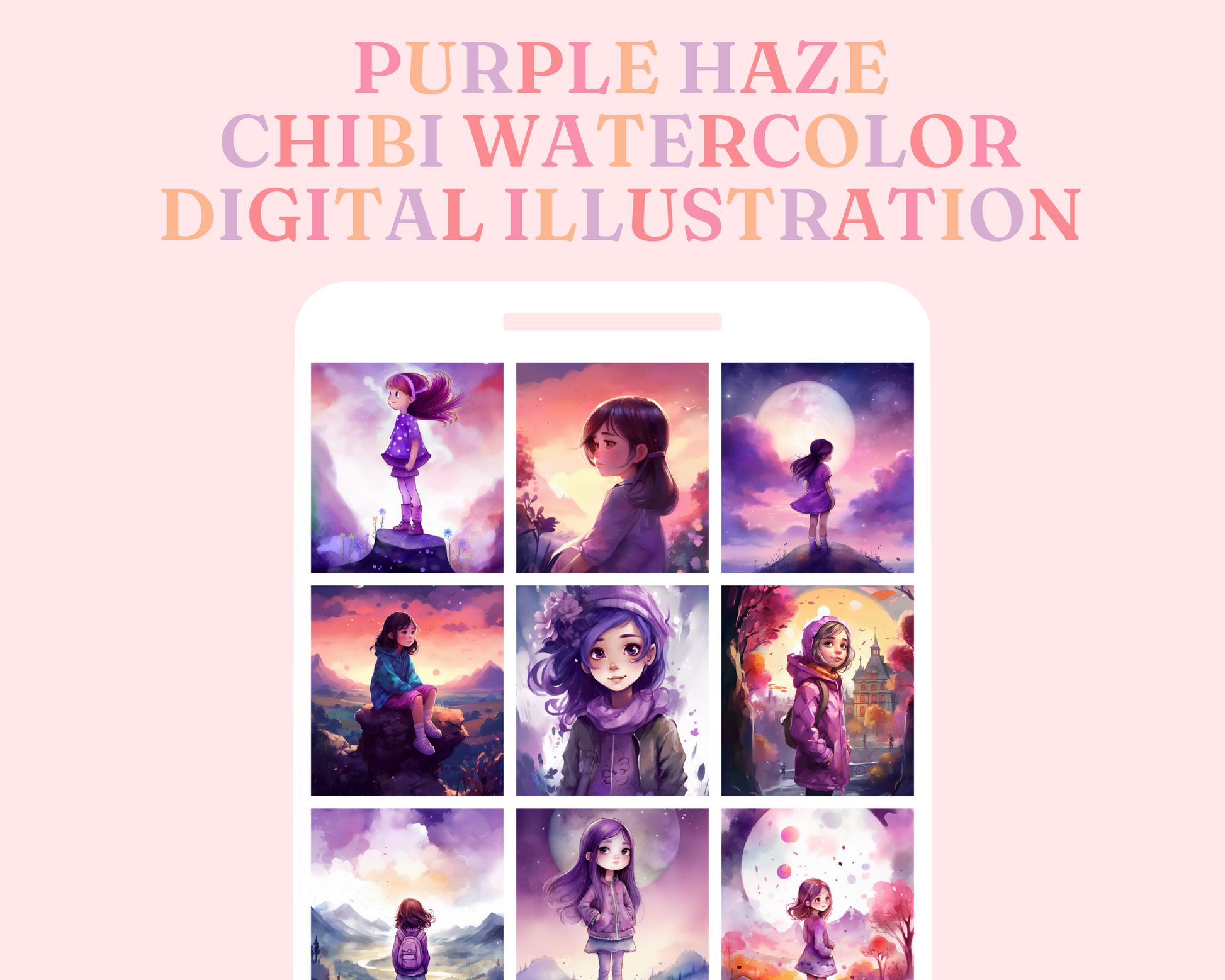 Purple Haze Chic Chibi Watercolor Digital Illustration - Commercial Use - Pretty - Instant Download