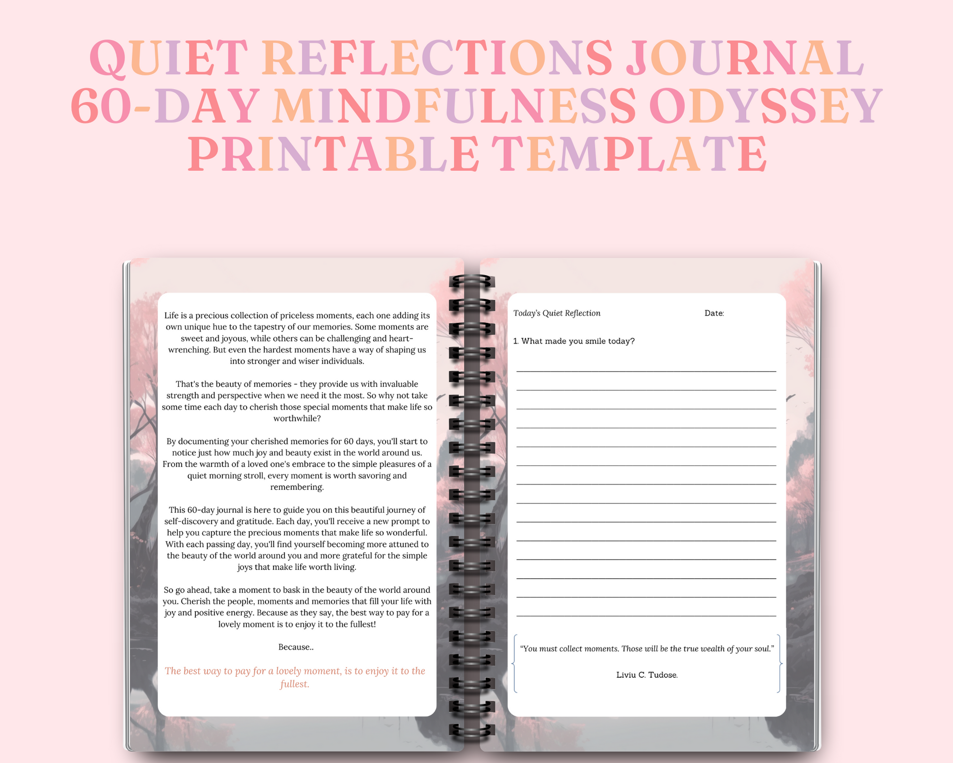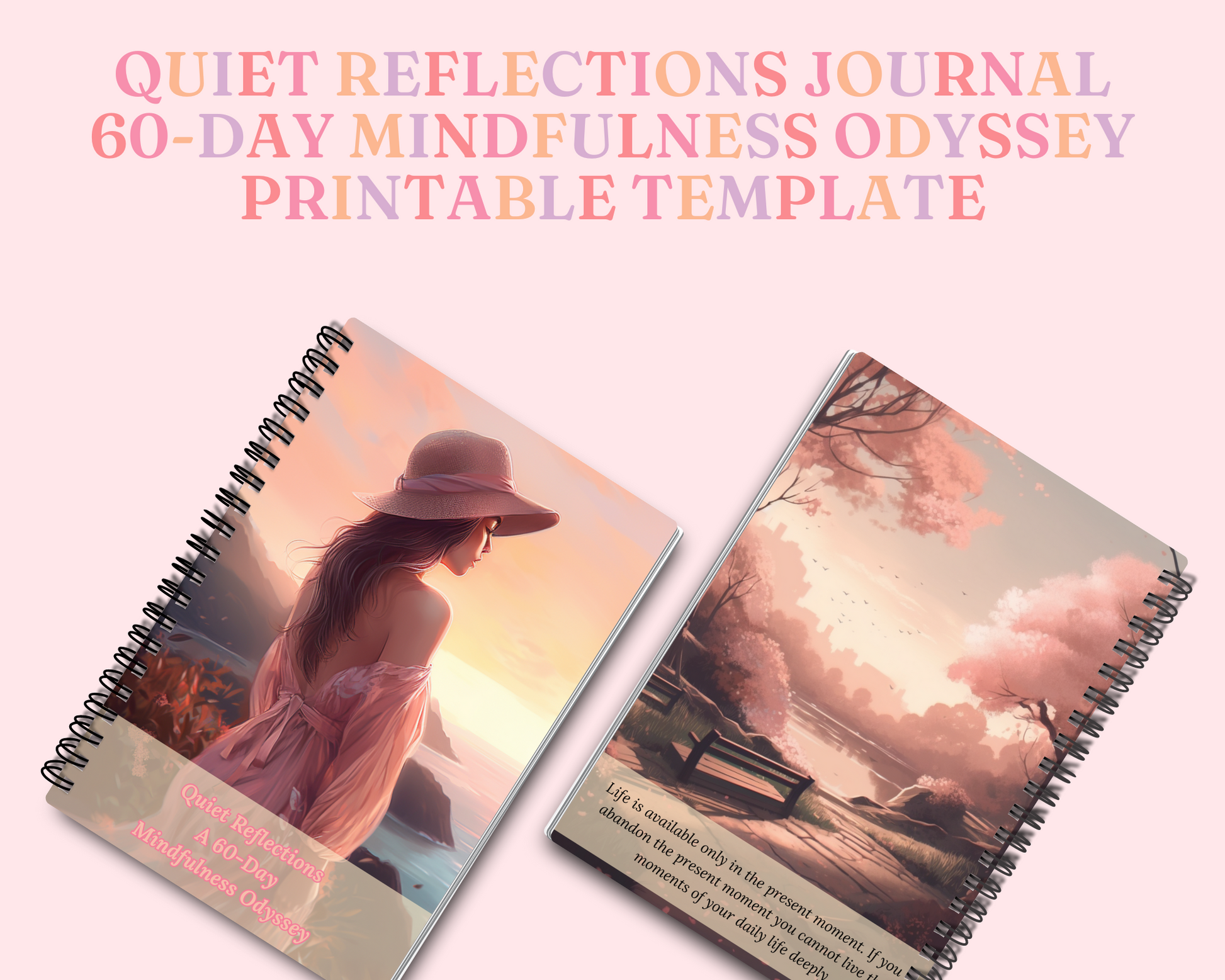 ✨ Embark on a journey of self-discovery and inner peace with our Quiet Reflections Journal – A 60-Day Mindfulness Odyssey. This beautifully designed journal features inspiring quotes and thought-provoking prompts to guide you through a transformative journey of mindfulness, self-awareness, and personal growth. With stunning front and back cover illustrations, this A4-sized journal is the perfect companion to help you cultivate clarity, focus, and serenity in your daily life. ✨