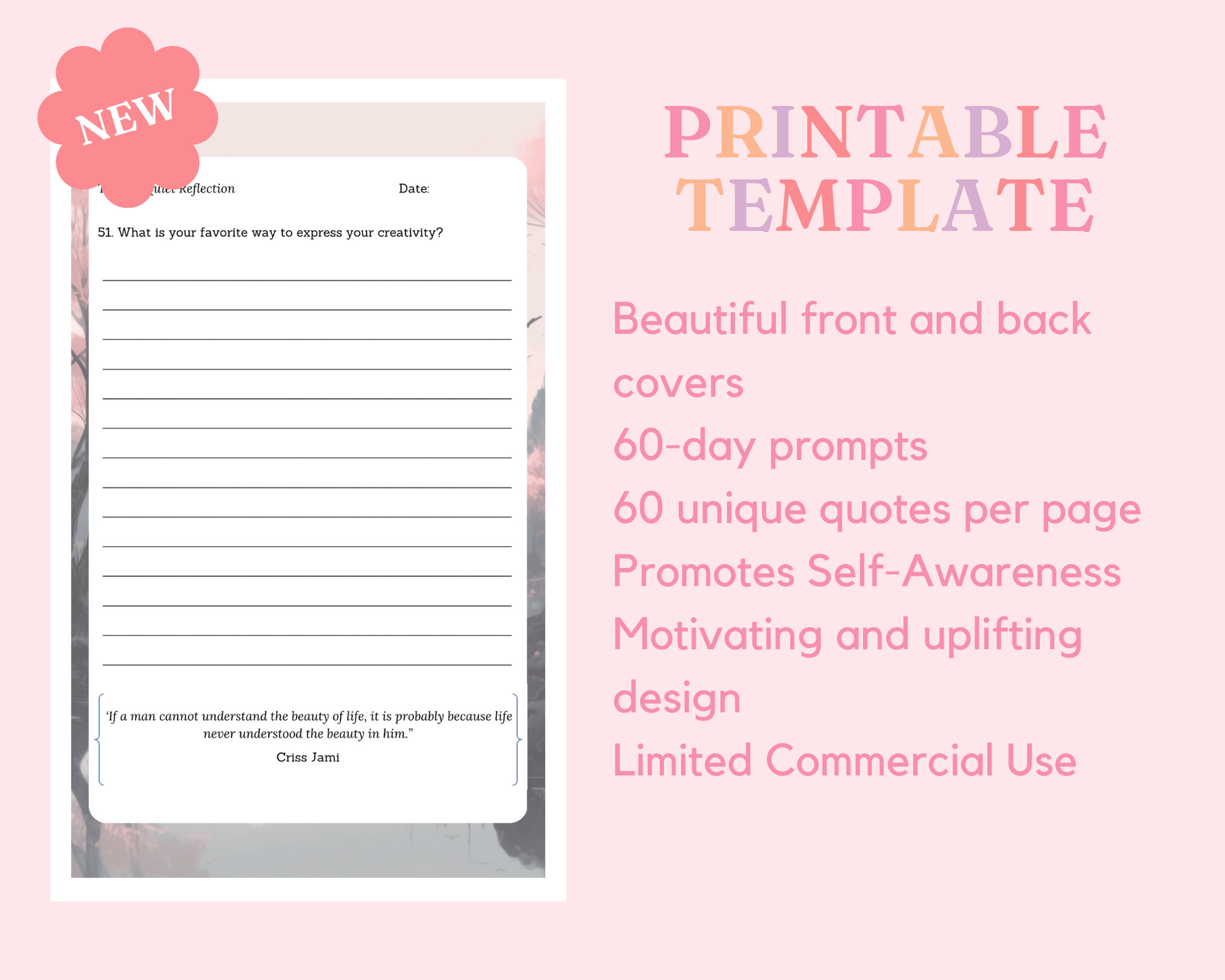 The Quiet Reflections Journal is designed to help you explore your inner world and discover your true potential. With 60 daily prompts and inspiring quotes, this journal will guide you through a transformative journey of mindfulness, self-awareness, and personal growth. The prompts are specifically designed to help you cultivate clarity, focus, and serenity in your daily life, while the quotes provide motivation and encouragement along the way.