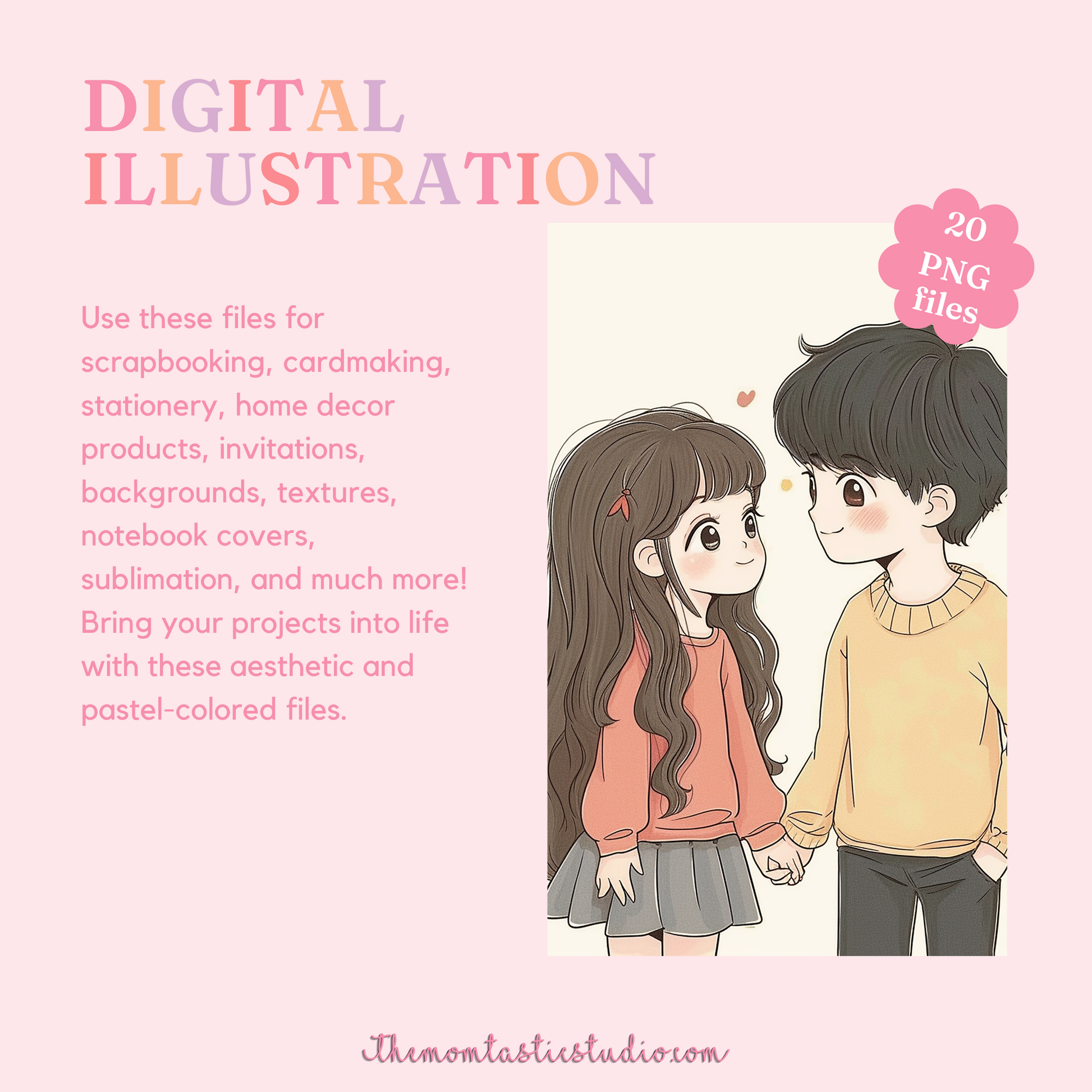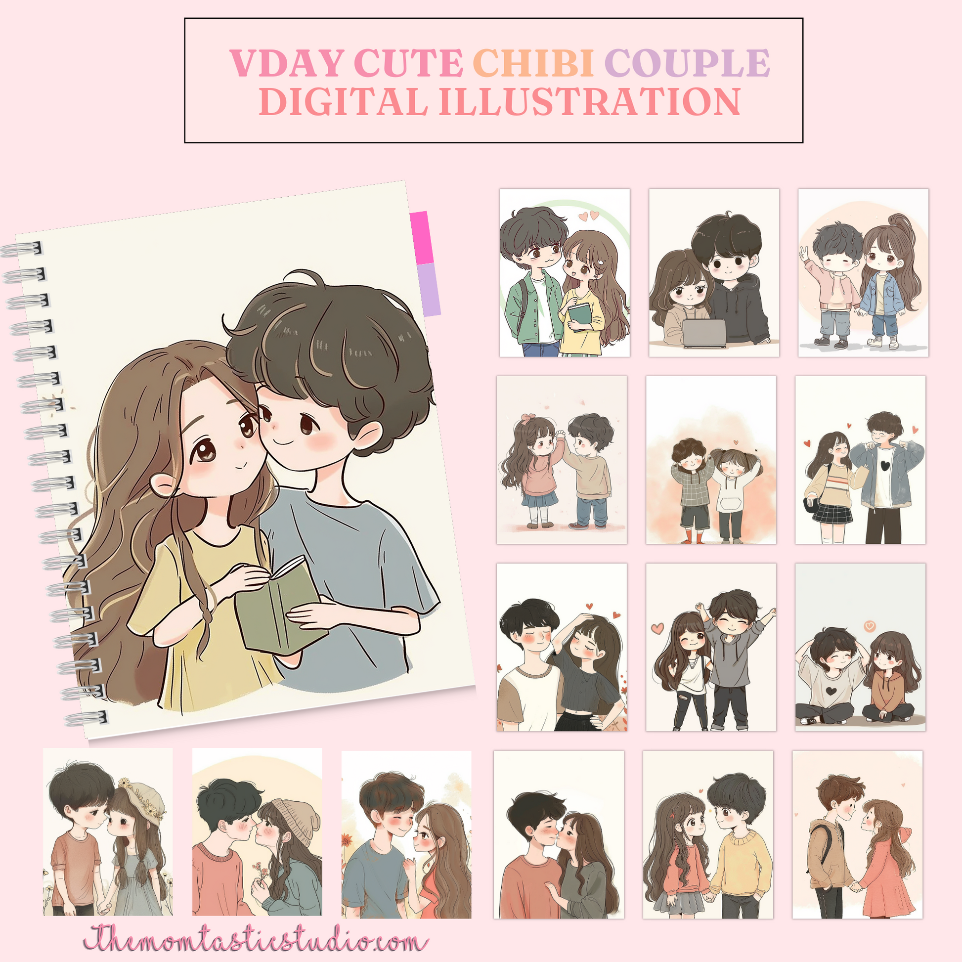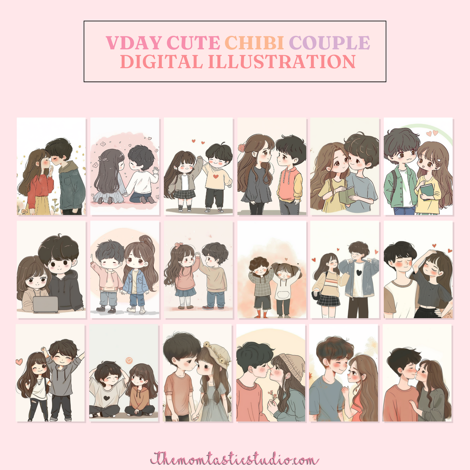 VDay Cute Chibi Couple Digital Illustration 300DPI – Instant Download – Commercial Use