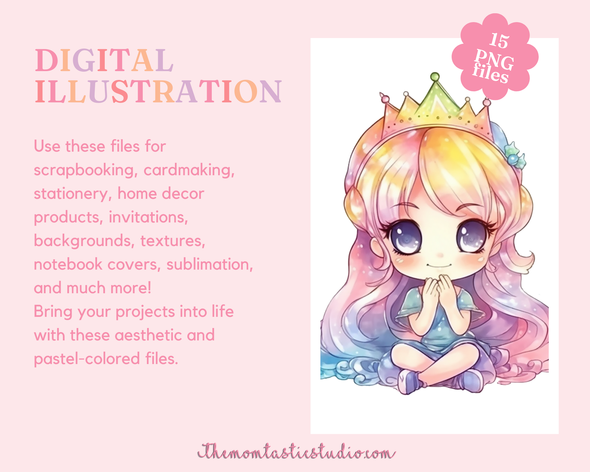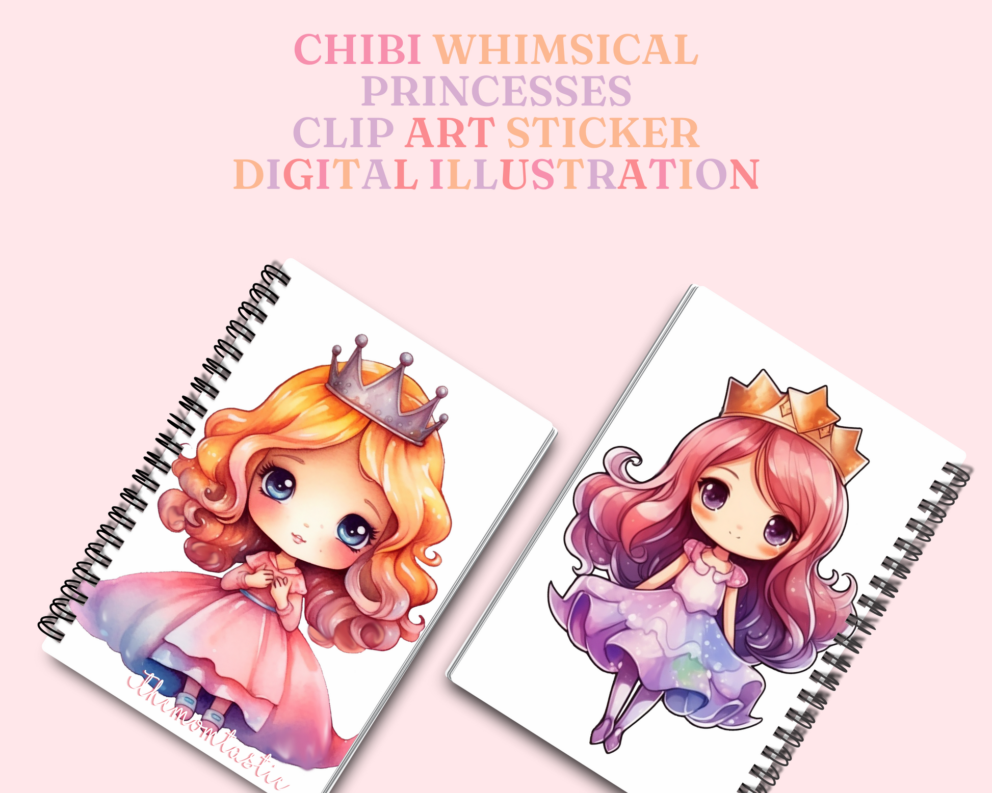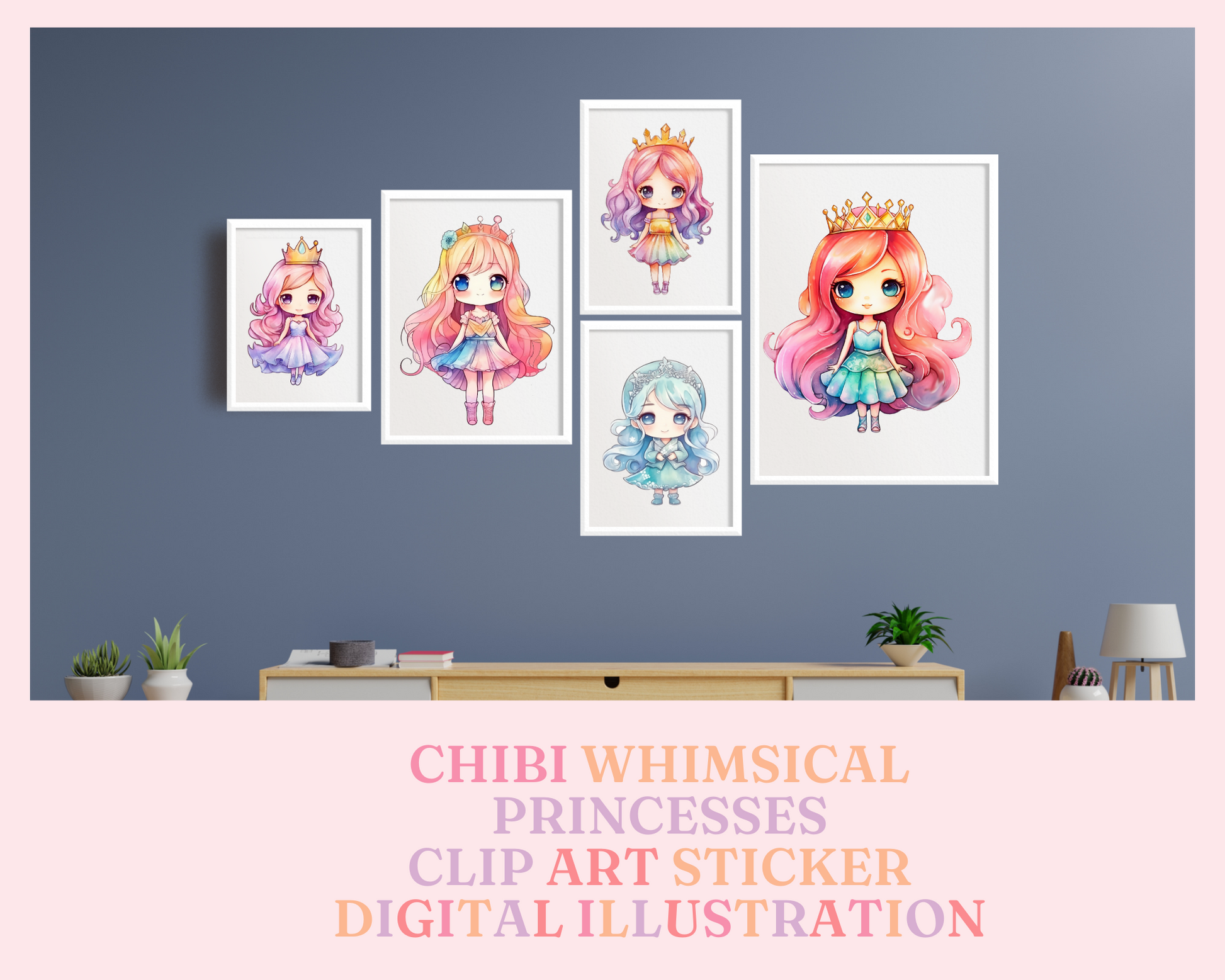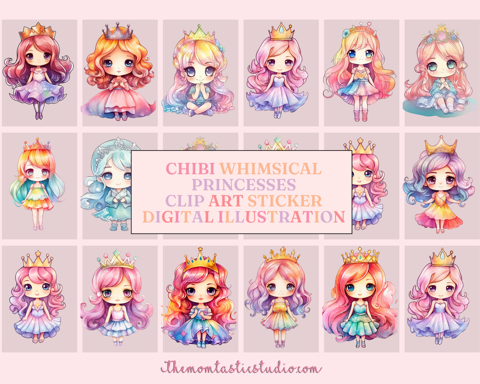 Whimsical Chibi Princesses Sticker Clipart – Instant Download – High-Quality PNG - Transparent Background - Commercial Use