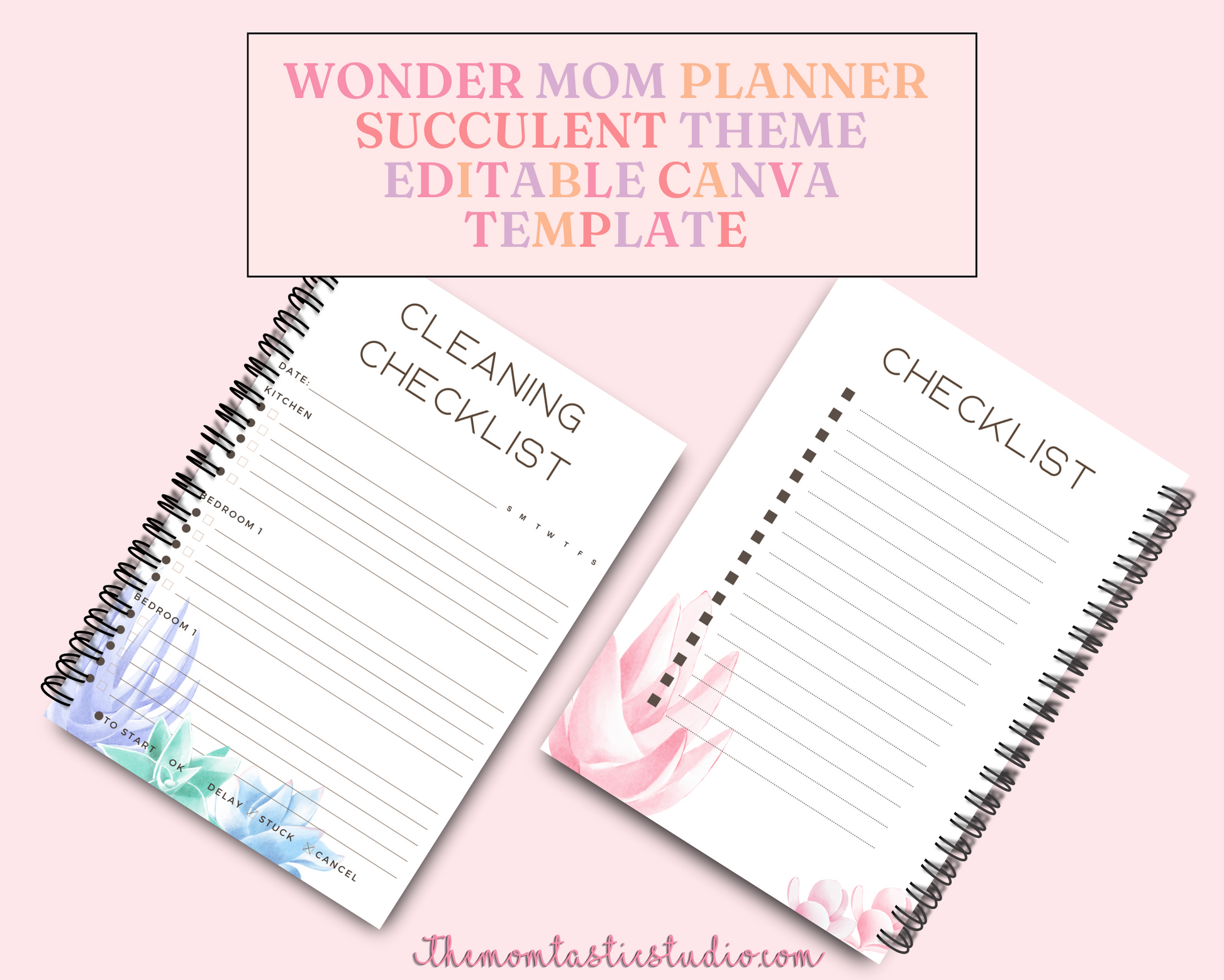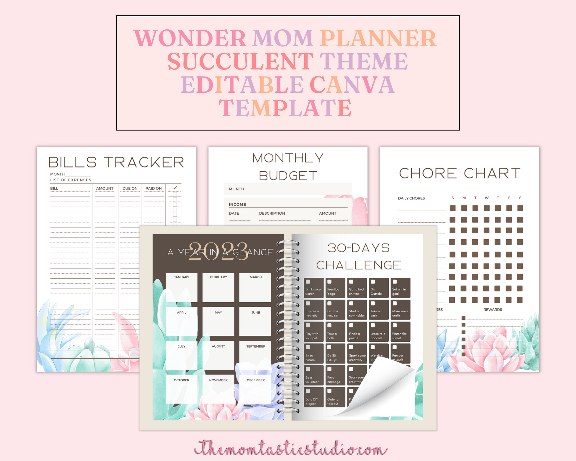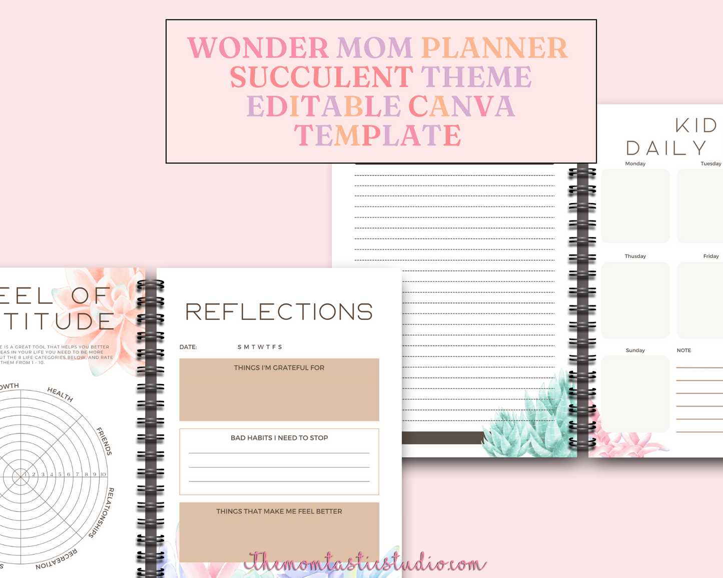 WonderMom Planner - Daily, Weekly, Monthly, Budget, Bills, Checklists, Lists, Notes, Reflections, Meal Plan, Chore Chart, Family Calendar, Shopping List Pages (Succulent Theme) - Canva Editable