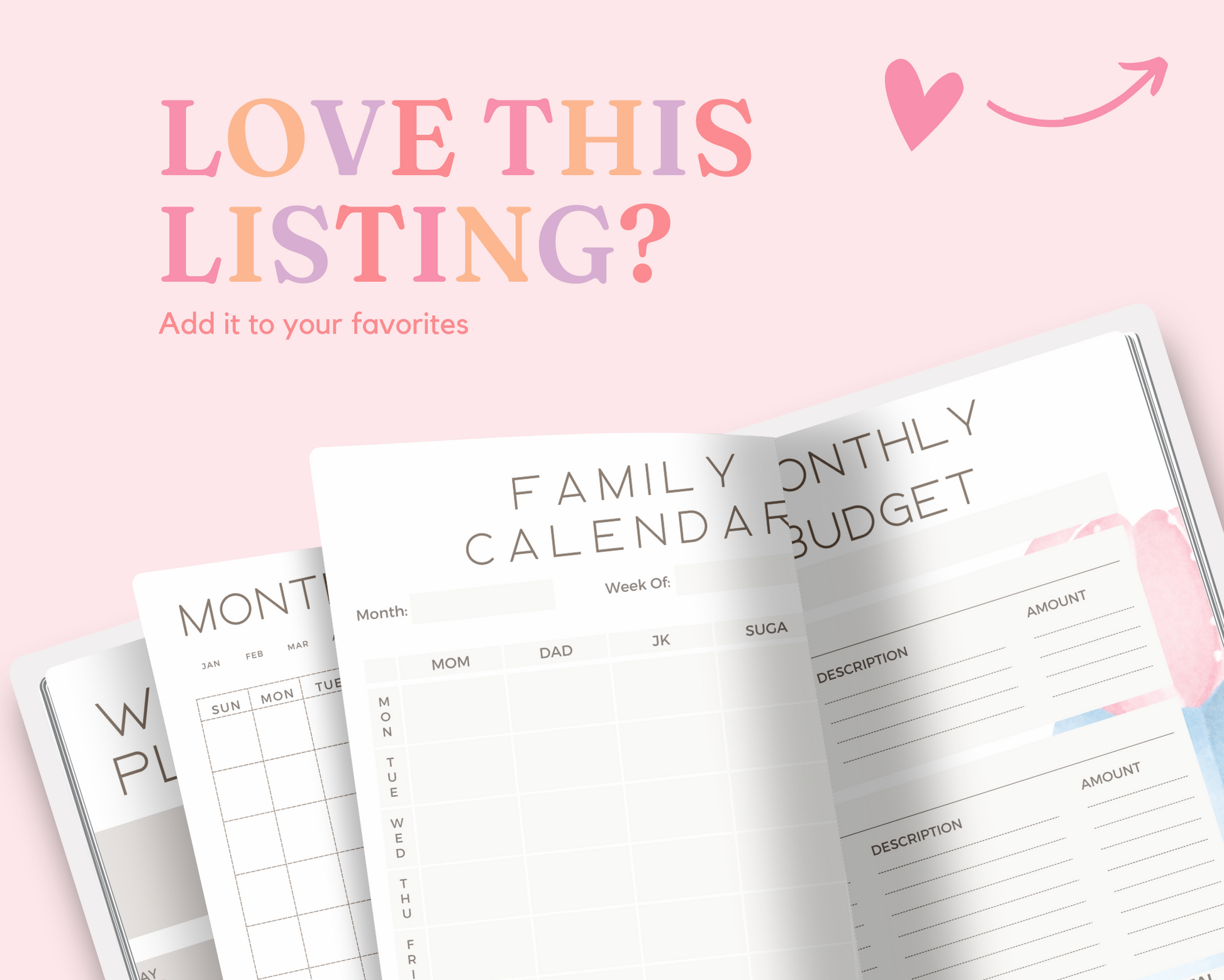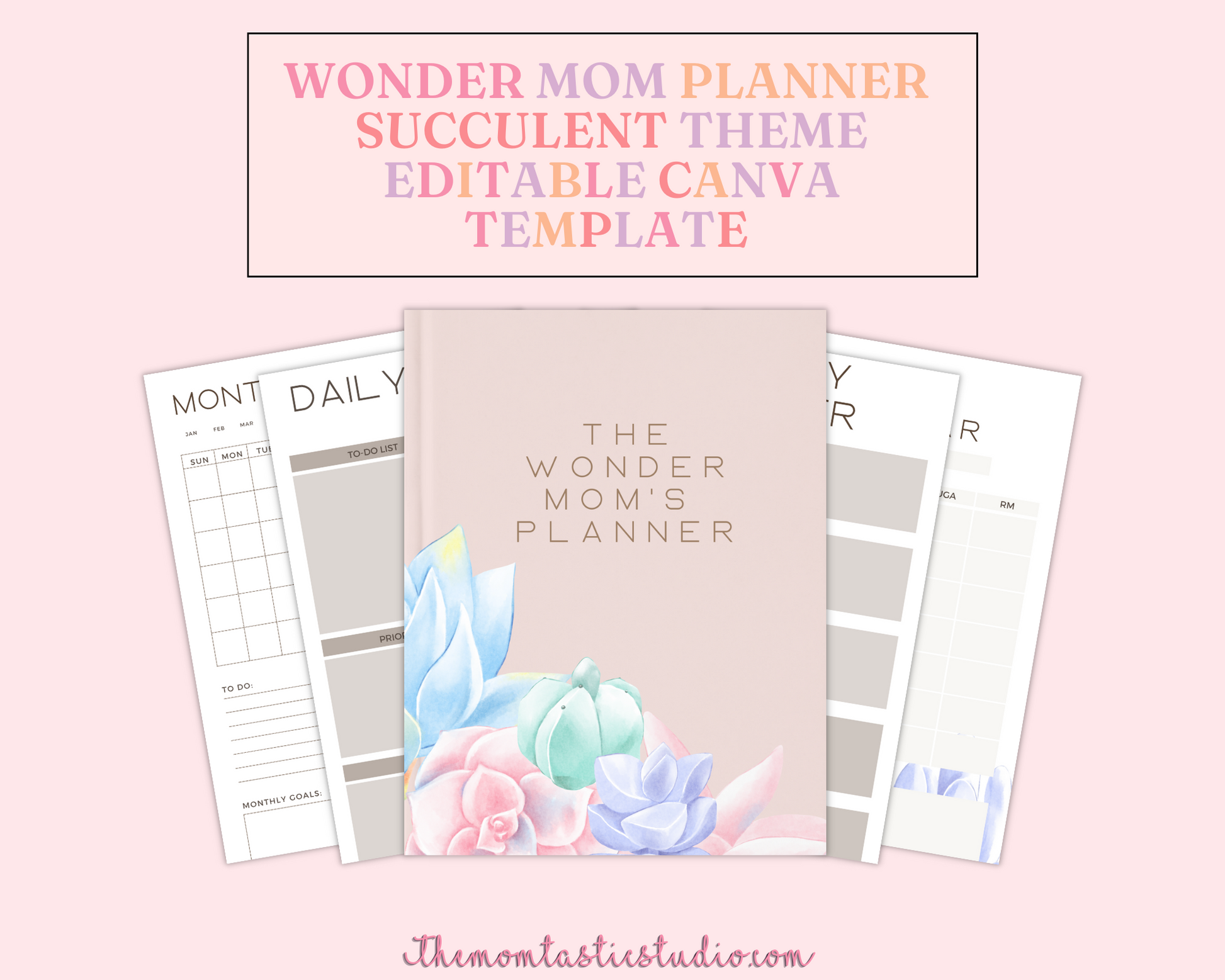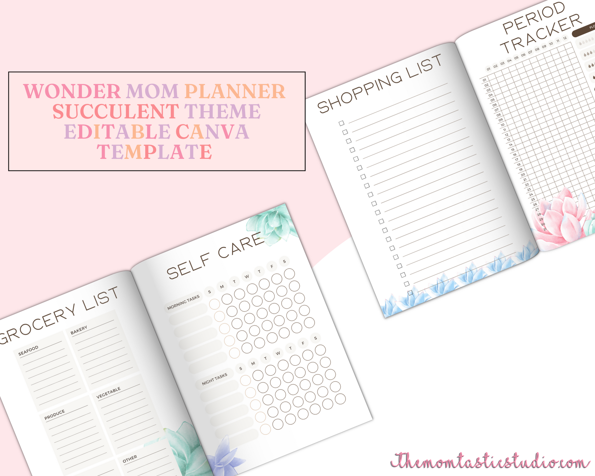 WonderMom Planner - Daily, Weekly, Monthly, Budget, Bills, Checklists, Lists, Notes, Reflections, Meal Plan, Chore Chart, Family Calendar, Shopping List Pages (Succulent Theme) - Canva Editable