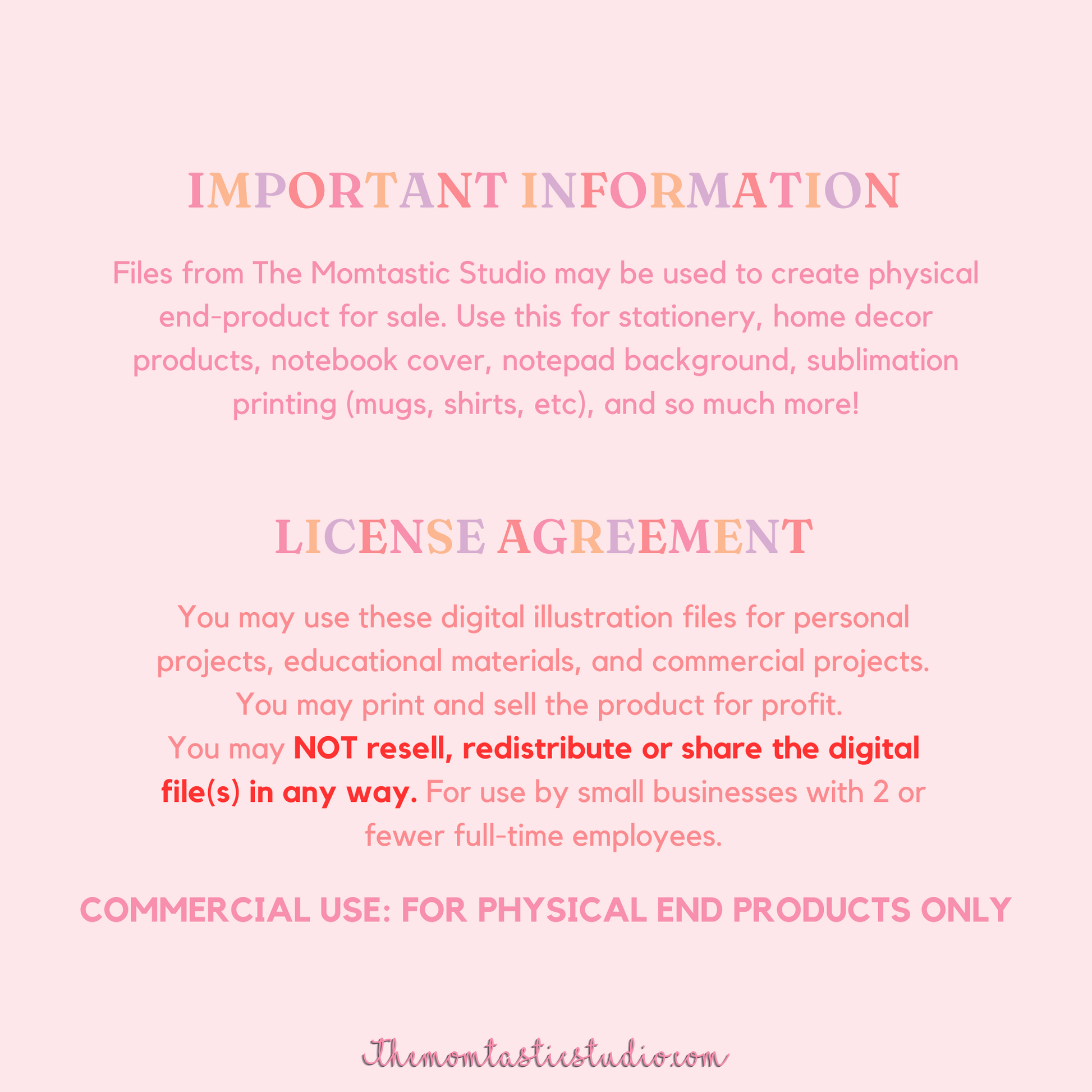 This digital product may be used to create physical end-product for sale. Use this for stationery, home decor products, notebook cover, notepad background, sublimation printing (mugs, shirts, etc), and so much more! You may NOT resell, redistribute or share the digital file(s) in any way.